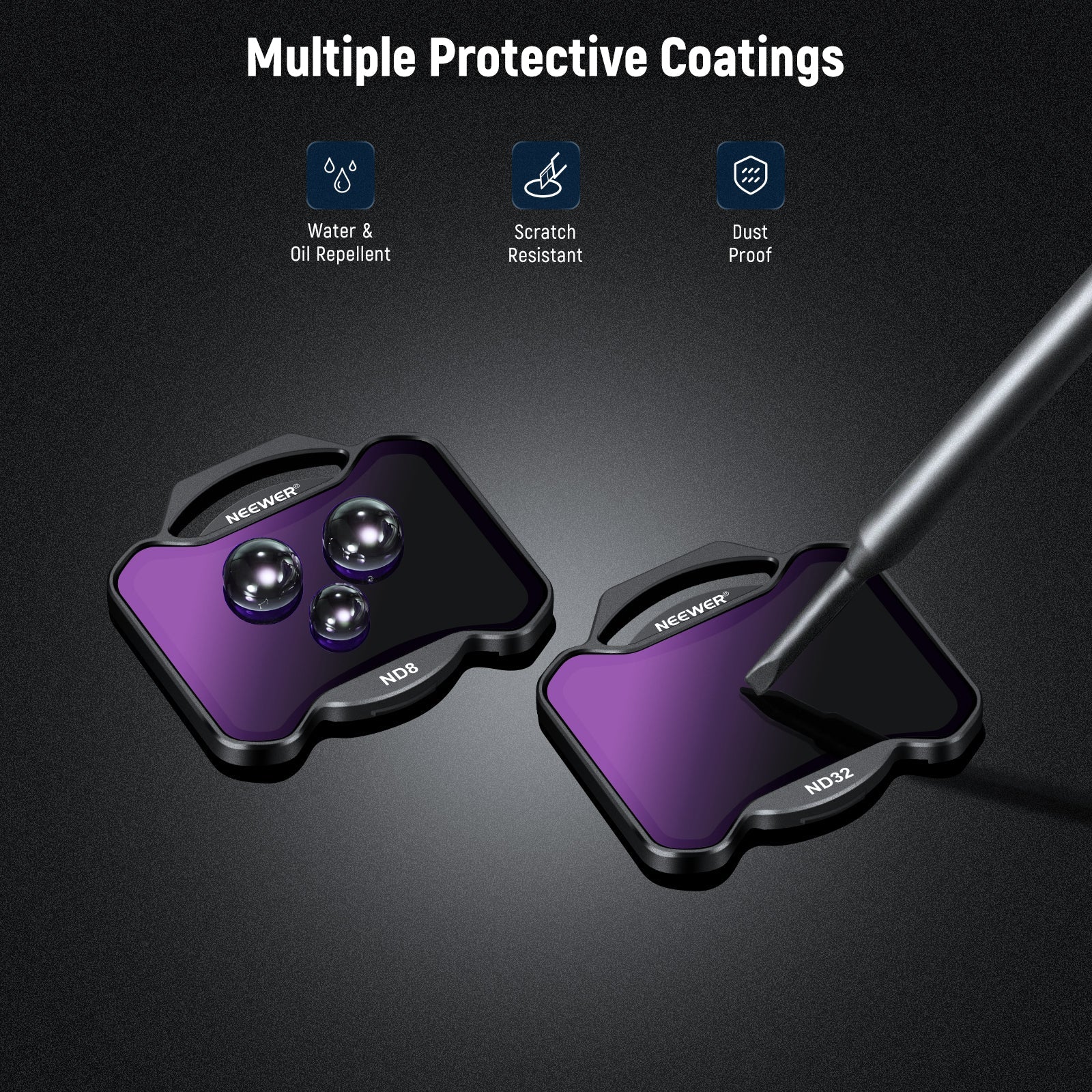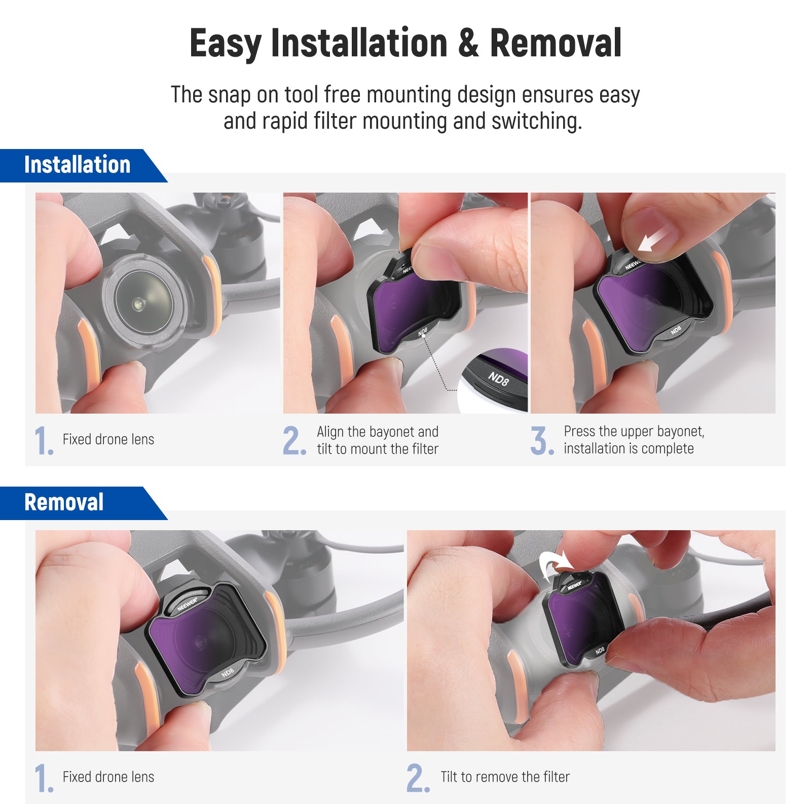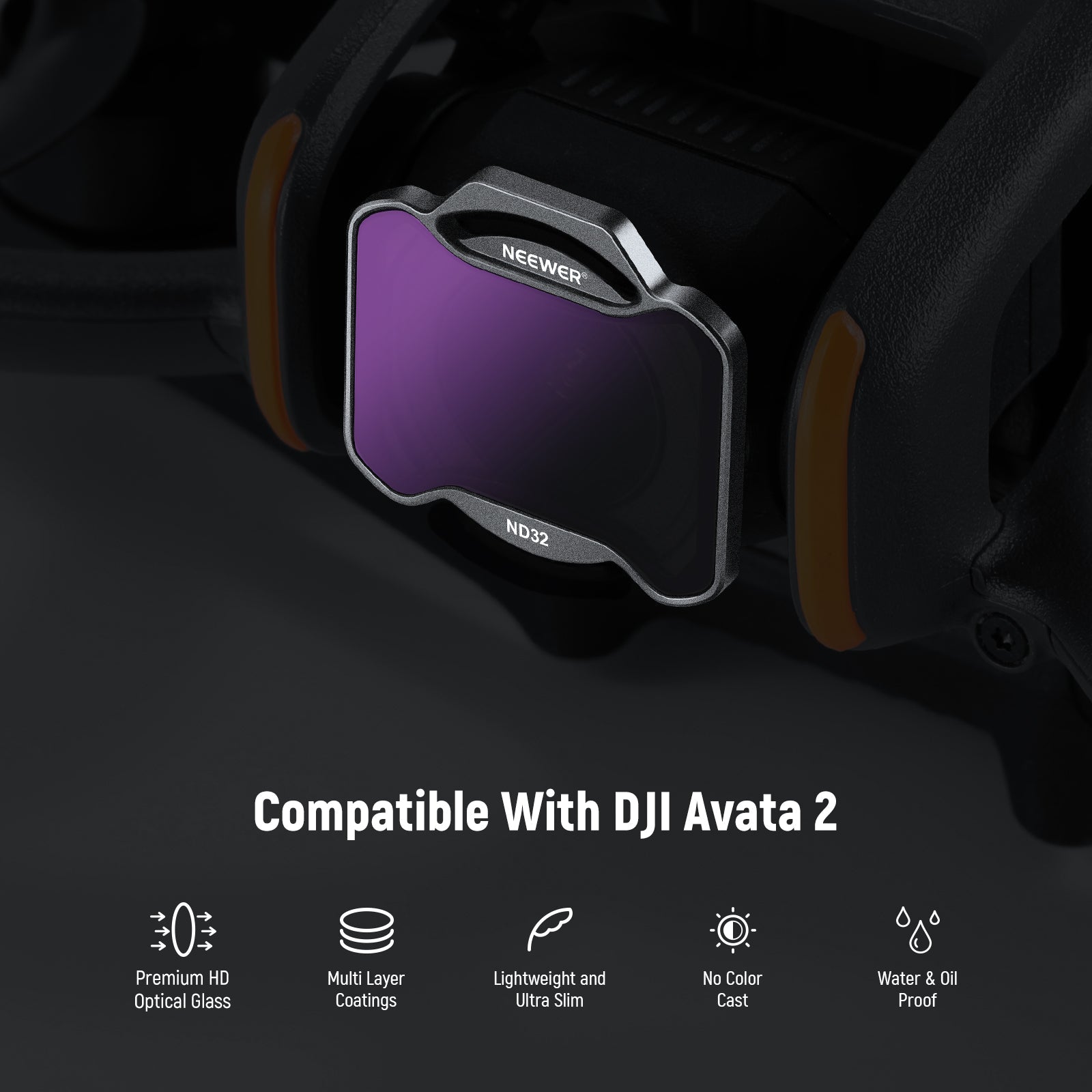 • Fully Compatible with Avata 2- NEEWER ND Filter Set Compatible with DJI Avata 2 includes ND8, ND16, ND32, and ND64, enabling you to select the perfect neutral density filter to precisely control the aperture and shutter speed. Mount NEEWER ND filter on your drone’s lens, improve exposure control in varying weather conditions to deliver magic and thrilling drone shots