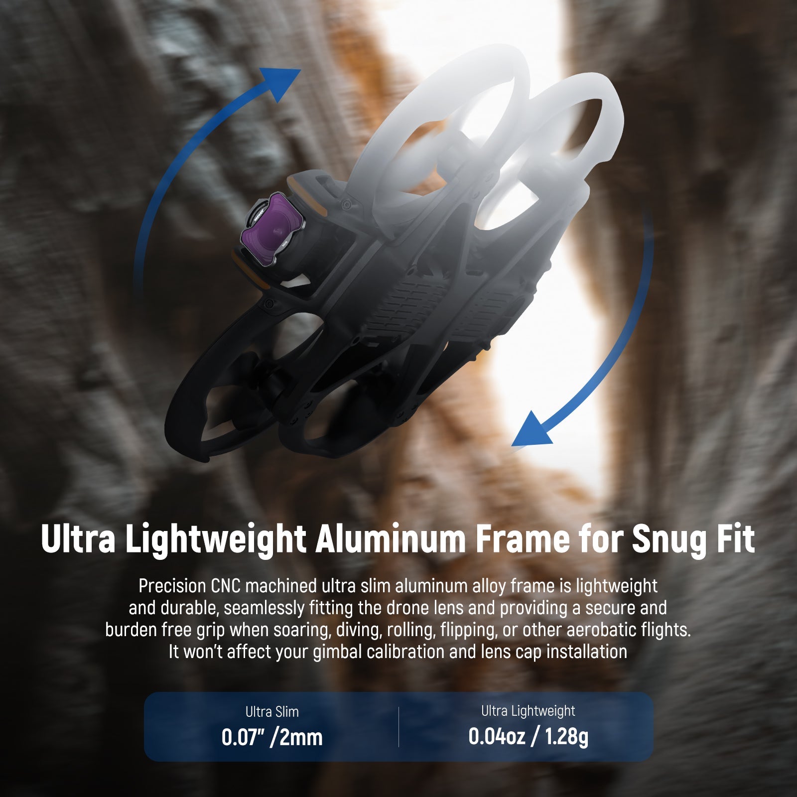 • Ultra Lightweight Aluminum Frame for Snug Fit- Precision CNC machined ultra slim aluminum alloy frame is lightweight and durable, seamlessly fitting the drone lens and providing a secure and burden free grip when soaring, diving, rolling, flipping, or other aerobatic flights. It won’t affect your gimbal calibration and lens cap installation