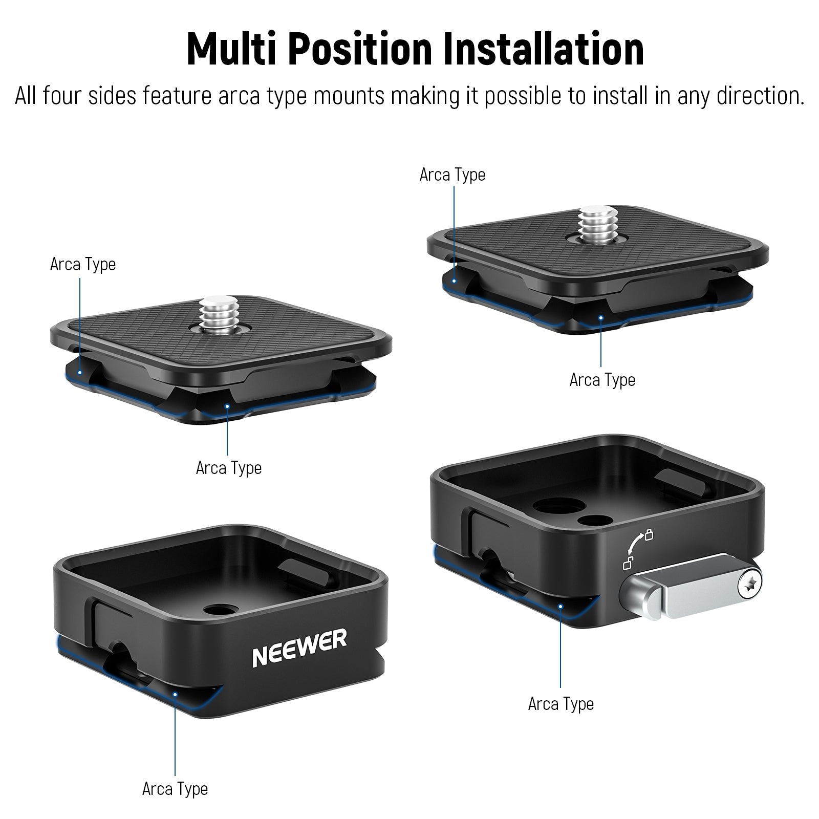 - Upgraded Four Side Arca Type QR Plate- The NEEWER CA009 Quick Release System Kit upgrades the top quick release plate, which has Arca type slots on all four sides, allowing you to achieve a quick switch from the gimbal stabilizer to the tripod head with no regard for mounting orientation. The base also comes with a mounting system compatible with Arca Swiss for a variety of tripod heads