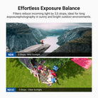 • Effortless Exposure Balance- Four neutral density filters (ND 8/16/32/64) reduce light by 3, 4, 5, and 6 stops for long exposure photography outdoors. They allow you to capture rivers, waterfalls, and other movements with expressive motion blur
