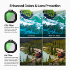 • Protective & Clear UV Filter- Significantly reduces gray cast caused by UV rays for sharp images or functions as a lens protector— a perfect content creator essential gear and influencer must have equipment for aerial photography and footage