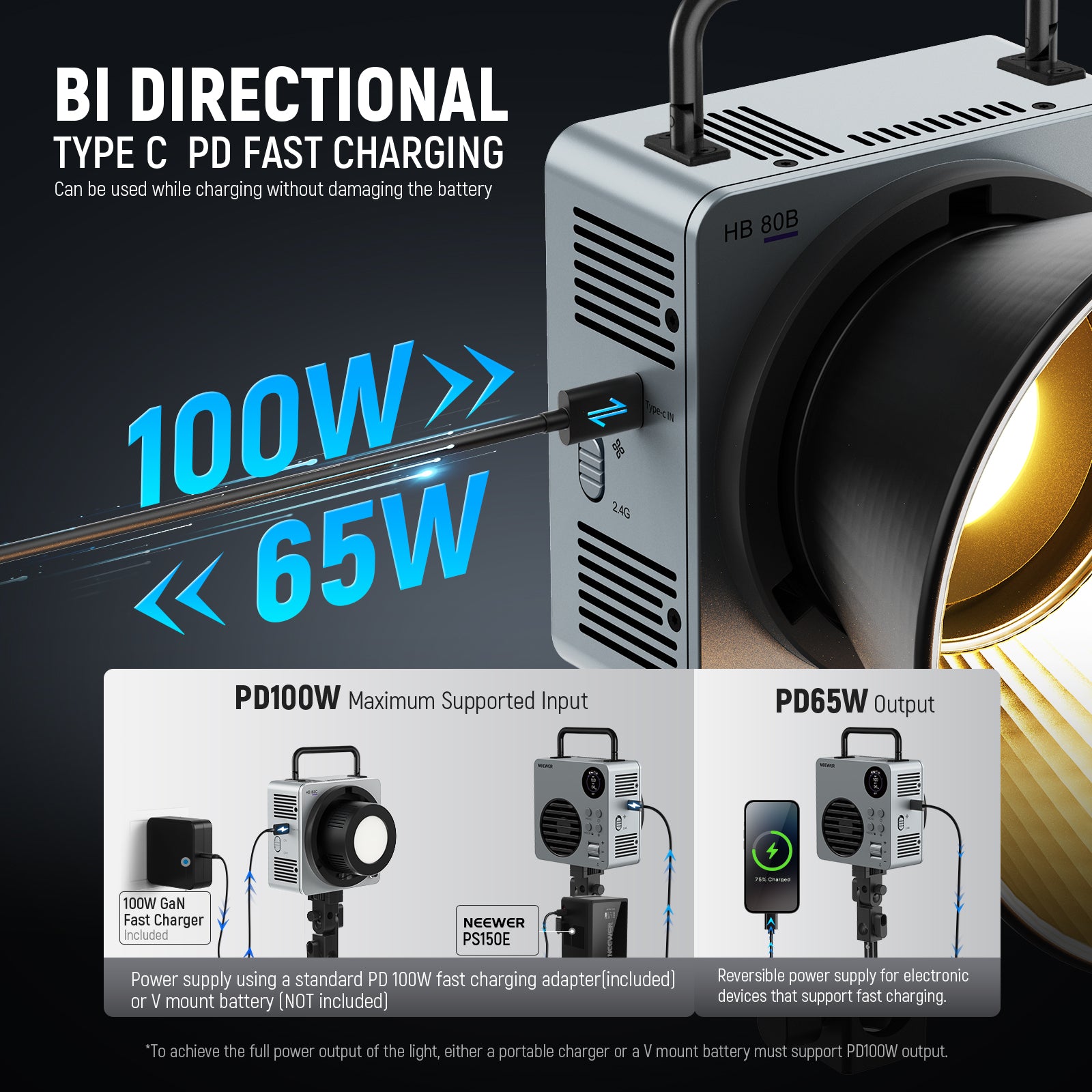 - 3 Fan Modes & Type C PD Fast Charging- The cooling fan has 3 modes: Mute (5W)/Regular (60W)/Booster (80W). Mute mode lasts approx. 1h 34min, Regular mode lasts 1h 14min at 100% brightness, Booster mode requires a PD100W adapter (NOT Included). The type C bidirectional port supports max PD 100W input and PD 60W output, allowing for a full charge in 2 hours when powered by a PD 60W or higher input. You can use the light while charging without damaging the battery