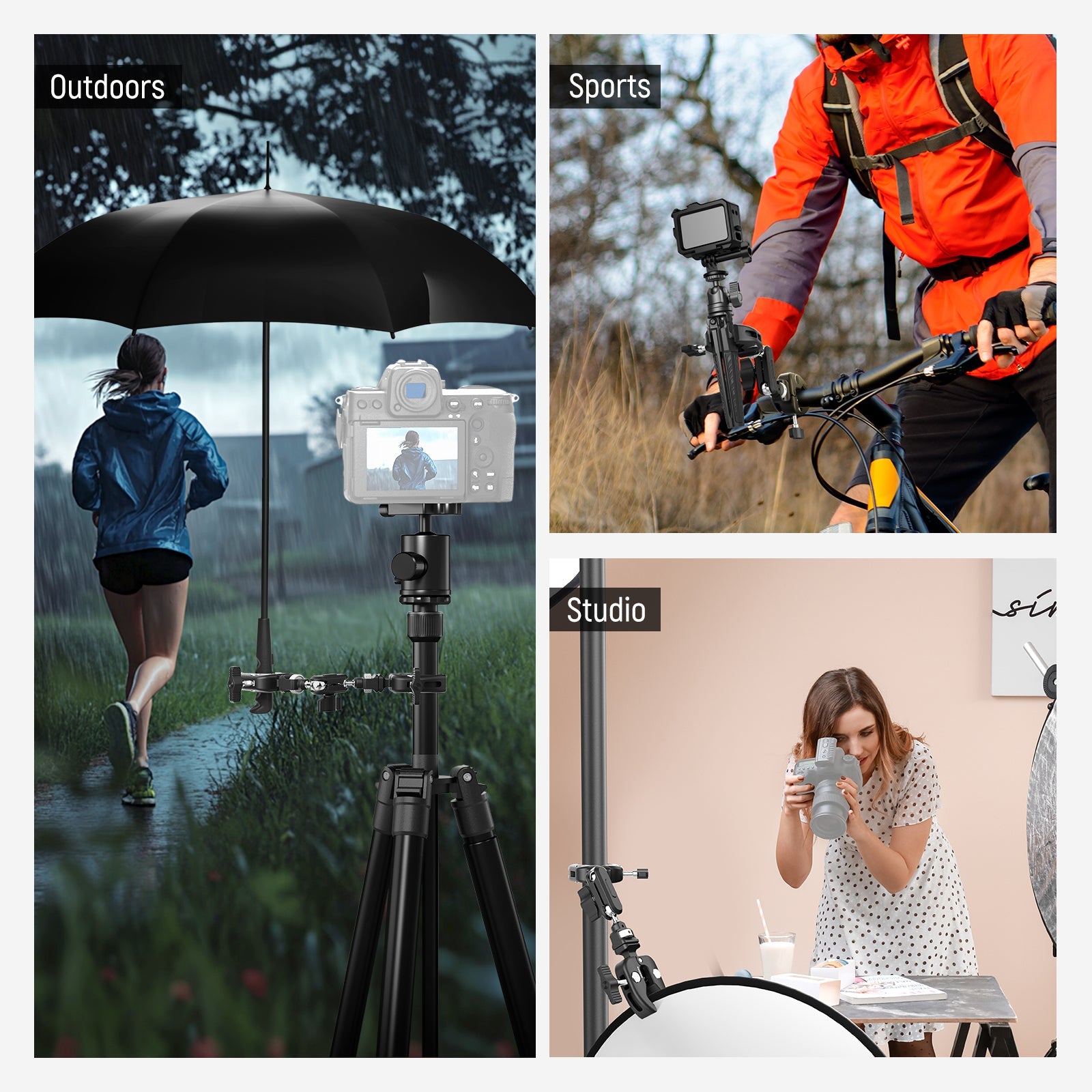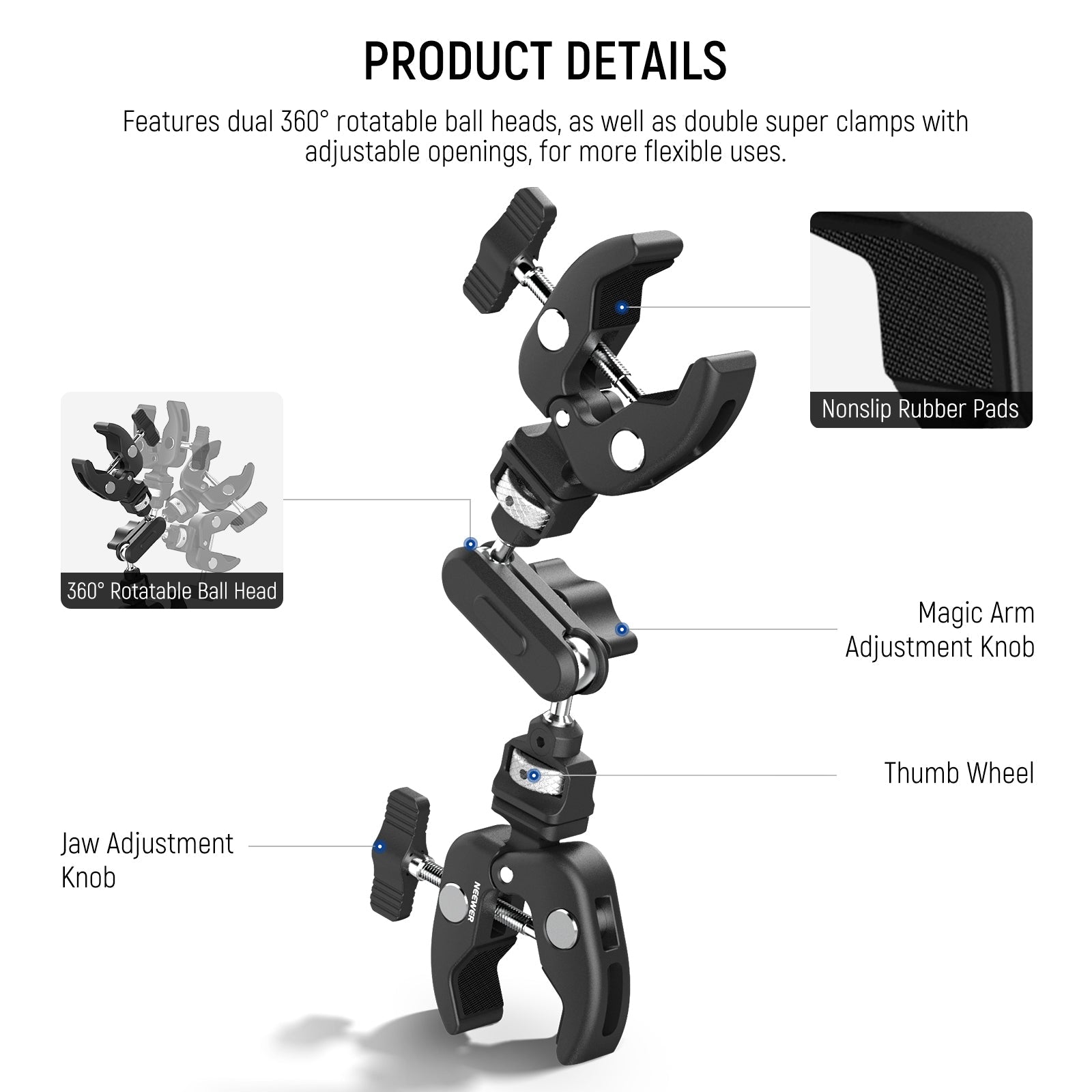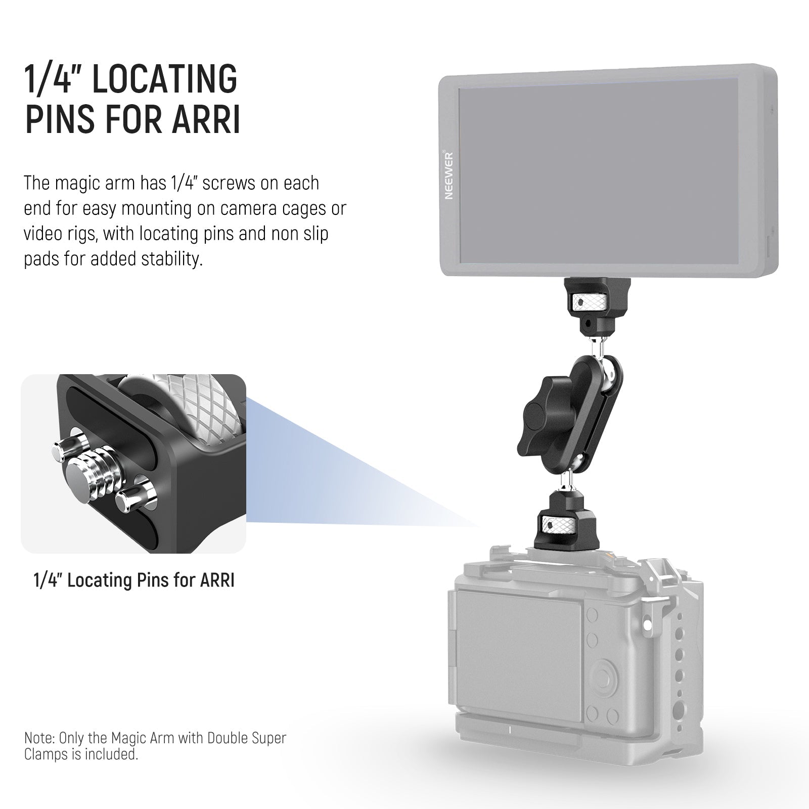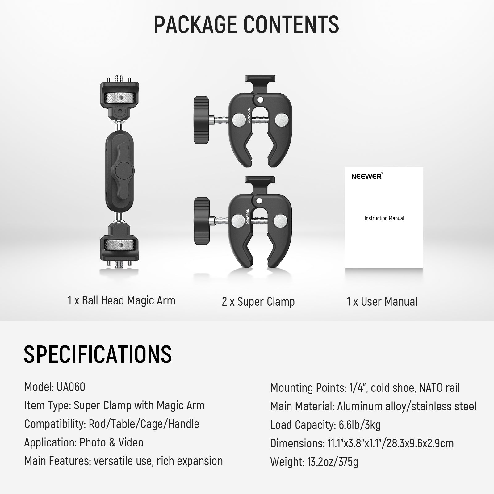 - Ball Head Magic Arm with Super Clamps- The NEEWER UA060 Magic Arm with Double Super Clamps is a versatile, practical, and economical tool designed for stable equipment mounting. The nonslip rubber pads on the super clamps prevent sliding and protect from scratches, while the two 360° rotatable ball heads allow for flexible positioning on tubular rods or flat surfaces, ideal for outdoor photography and video recording