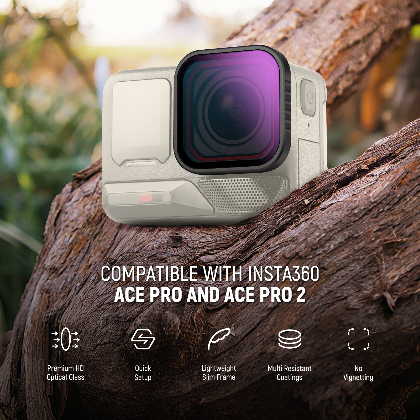 - For Ace Pro and Ace Pro 2- This 4-pack filter set (adjustable CPL + UV + black diffusion 1/4 + ND16) is compatible with Insta360 Ace Pro & Ace Pro 2. Each directly snaps onto the lens and stays in place via the rubber seal. Multiple coatings resist water, fingerprints, and scratches. Note: 1. Not for underwater use, as water will enter and degrade image quality. 2. Not compatible with an updated version of the Ace Pro 2 featuring a redesigned lens guard, which is a round octagonal shape