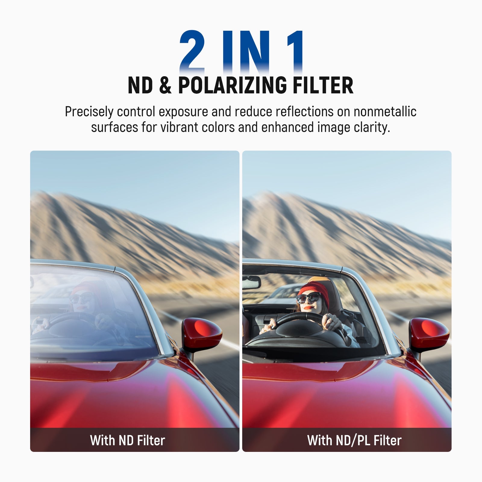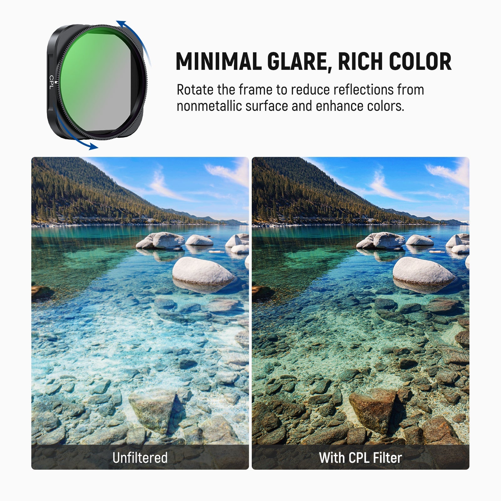 - Minimal Glare, Rich Color- Rotate the circular polarizing (polarizer) filter to eliminate reflections from water, glass, and other nonmetallic surfaces while enhancing contrast and saturation for a more vibrant color rendition