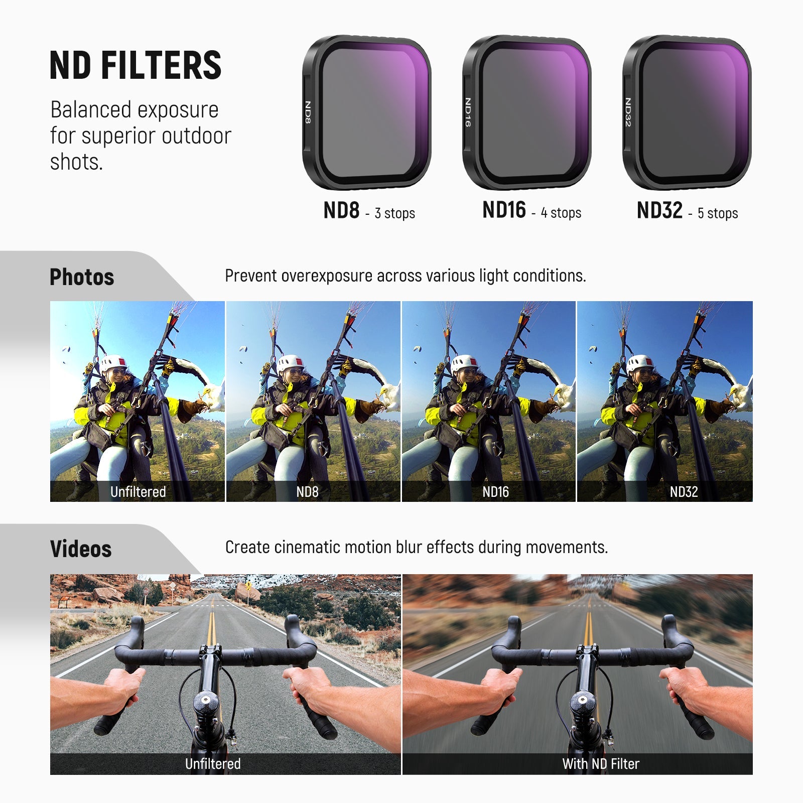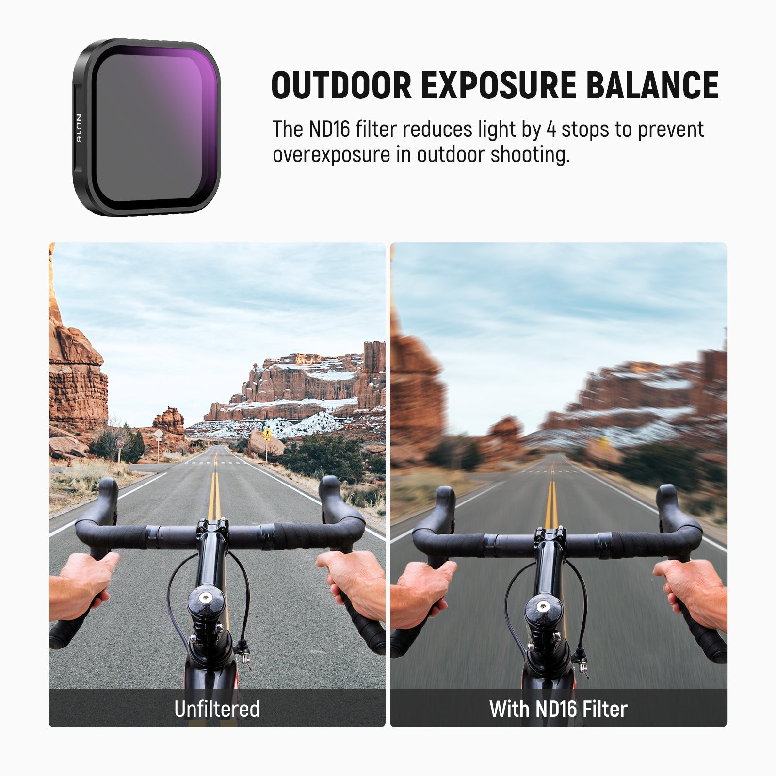 - Outdoor Exposure Balance- The ND16 neutral density filter for action camera lens reduces light by 4 stops to prevent overexposure in outdoor shooting and lets you capture waterfalls, rivers, light trails, and other moving subjects with a motion blur effect