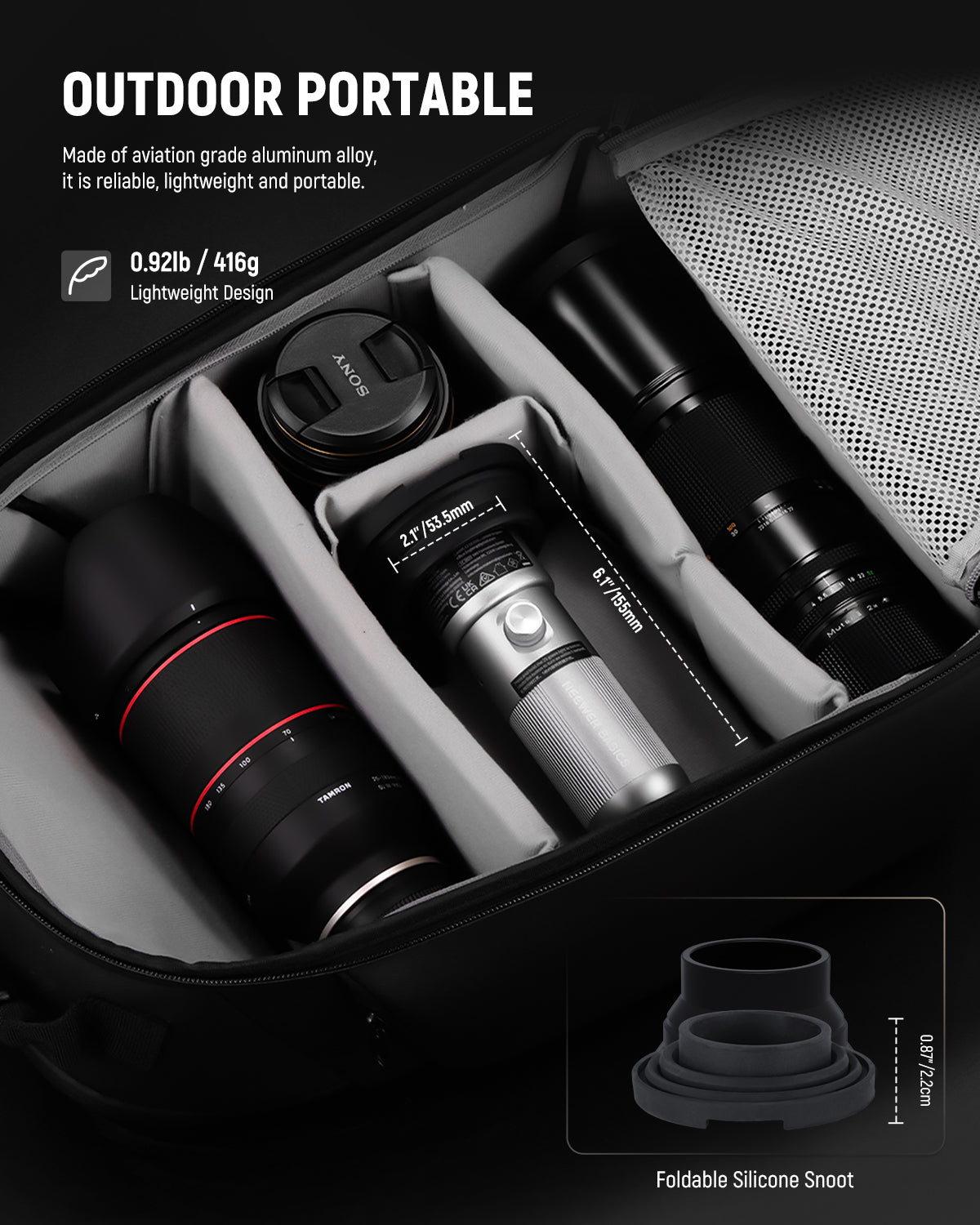 - Zoomable for Precise Aperture Control- The convex mirror barrel adopts a push pull design, allowing smooth zooming in and out to precisely adjust the light beam size as well as its reach within a smaller range (zoom angle approximately 10°-60°). This flexibility enables you to effortlessly control the lighting effect from a focused, intense beam to a broader, softer spread, offering a variety of lighting possibilities for different shooting scenarios