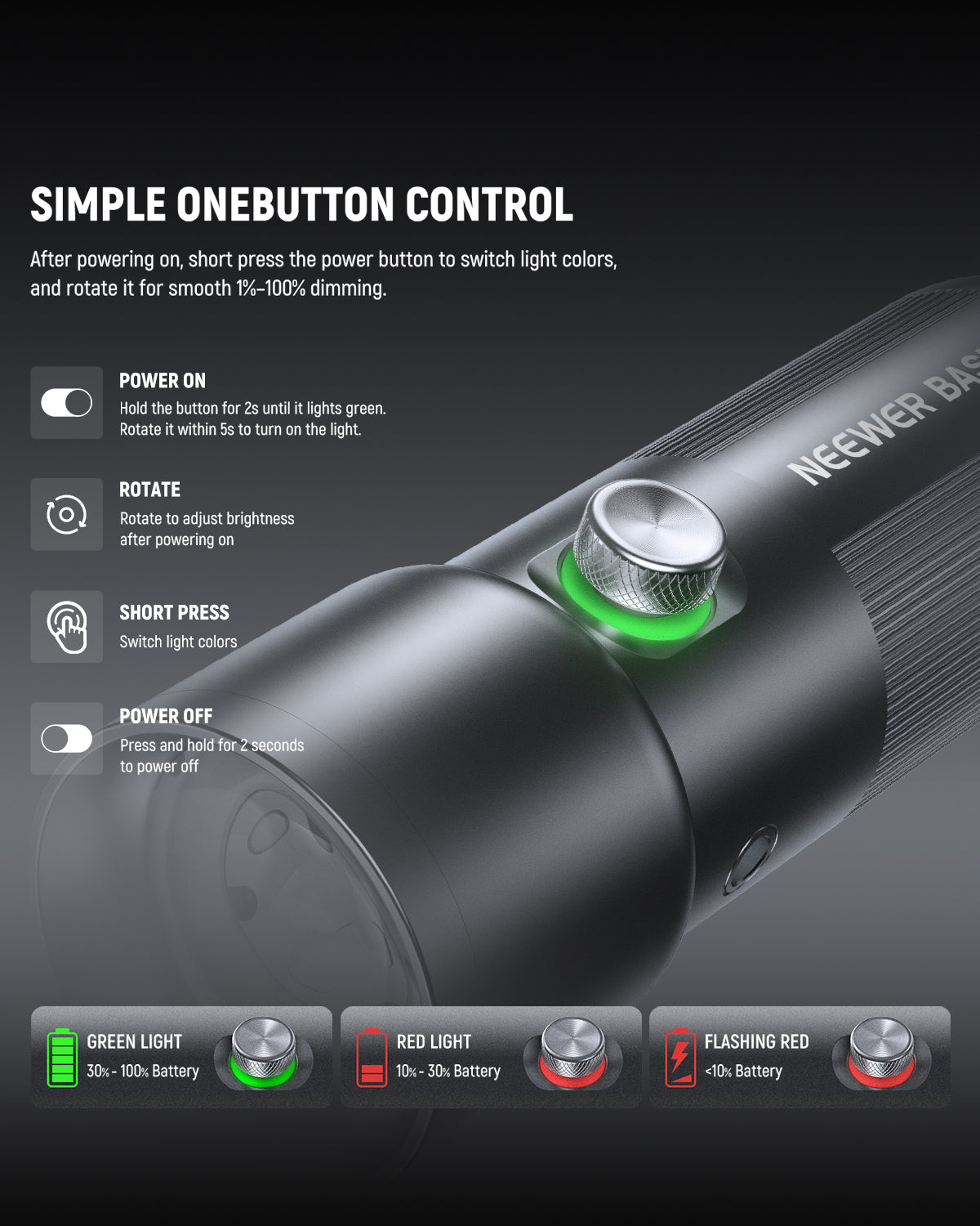 - One Button Control & Smart Battery Indicator- Featuring a convenient one button control design, the flashlight for photography allows easy color switching with a short press of the power button after turning it on. Or rotate it to adjust the brightness from 1%-100%. Integrated with an indicator light that signals the battery status: solid green for 30%-100%, solid red for 10%-30%, and flashing red for below 10%