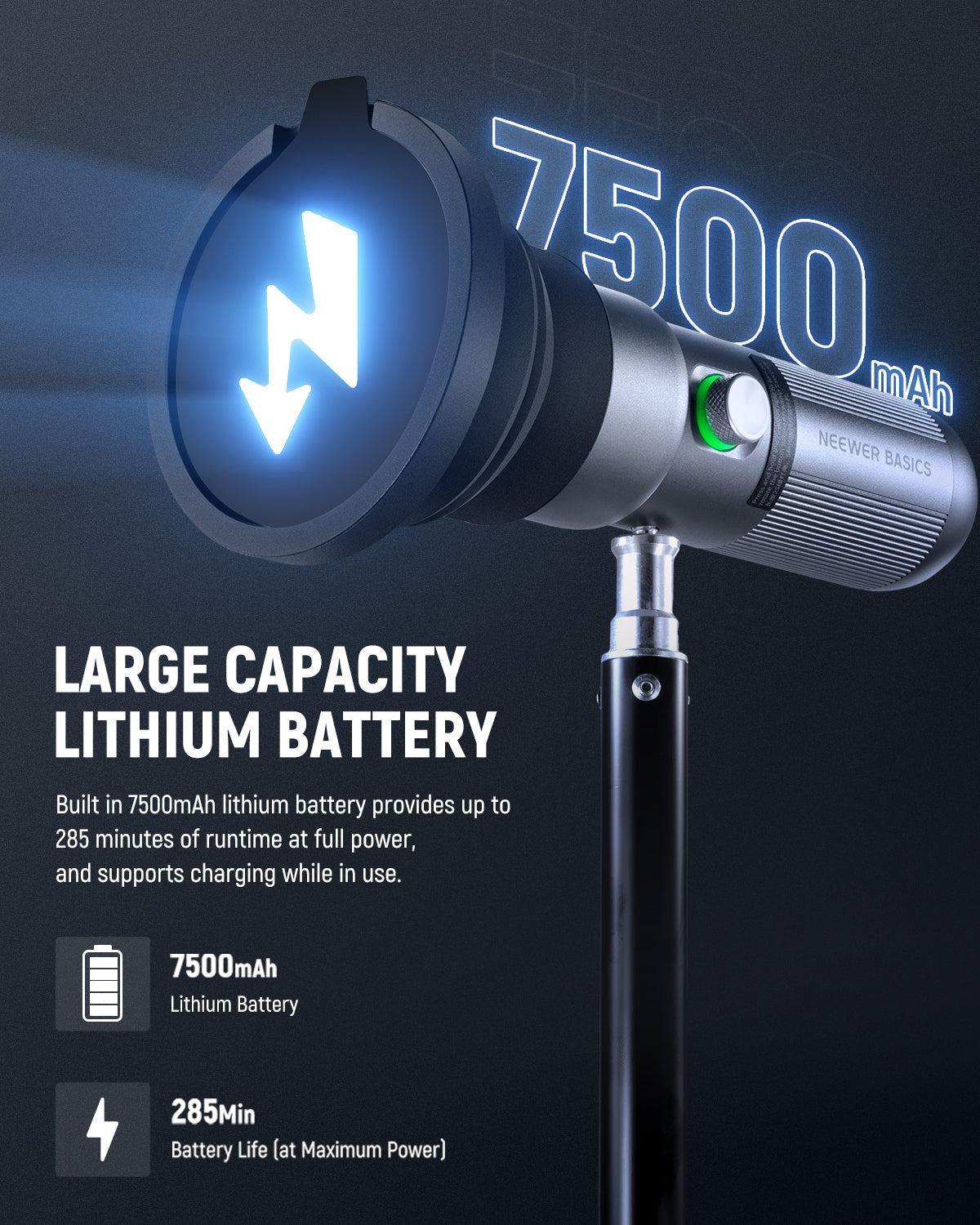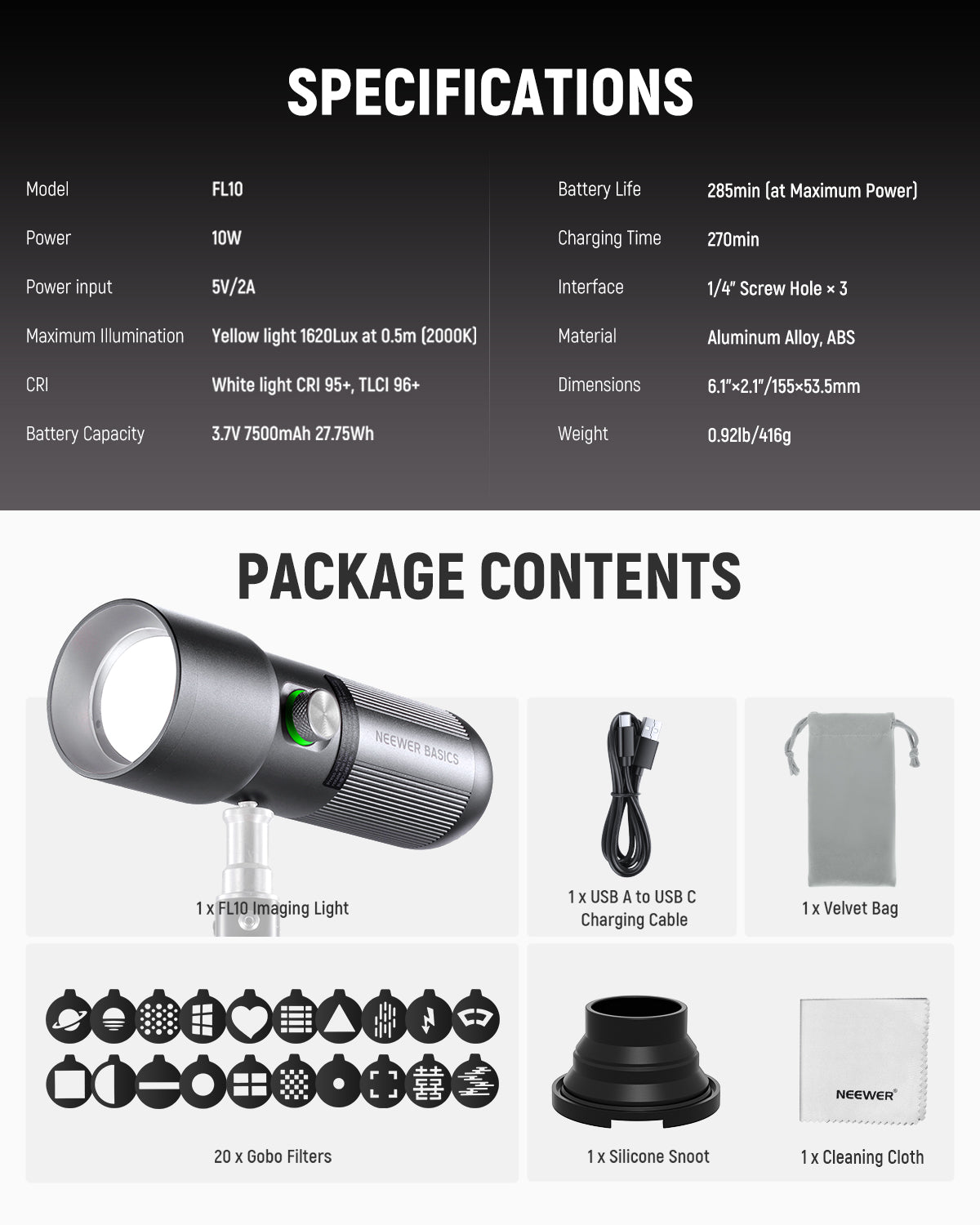 - Introducing NEEWER BASICS- Simple and practical, NEEWER BASICS is an economical product line that focuses on essential functions and designs, without unnecessary extras and materials. NEEWER FL10 is a portable photography flashlight for atmosphere. Measuring 6.1"x2.1" (155x53.5mm) and weighing just 0.92lb (416g), it is made from aluminum alloy for a sturdy yet lightweight design. Its compact size with a textured handle allows for a comfortable single hand grip, making it easy to use handheld