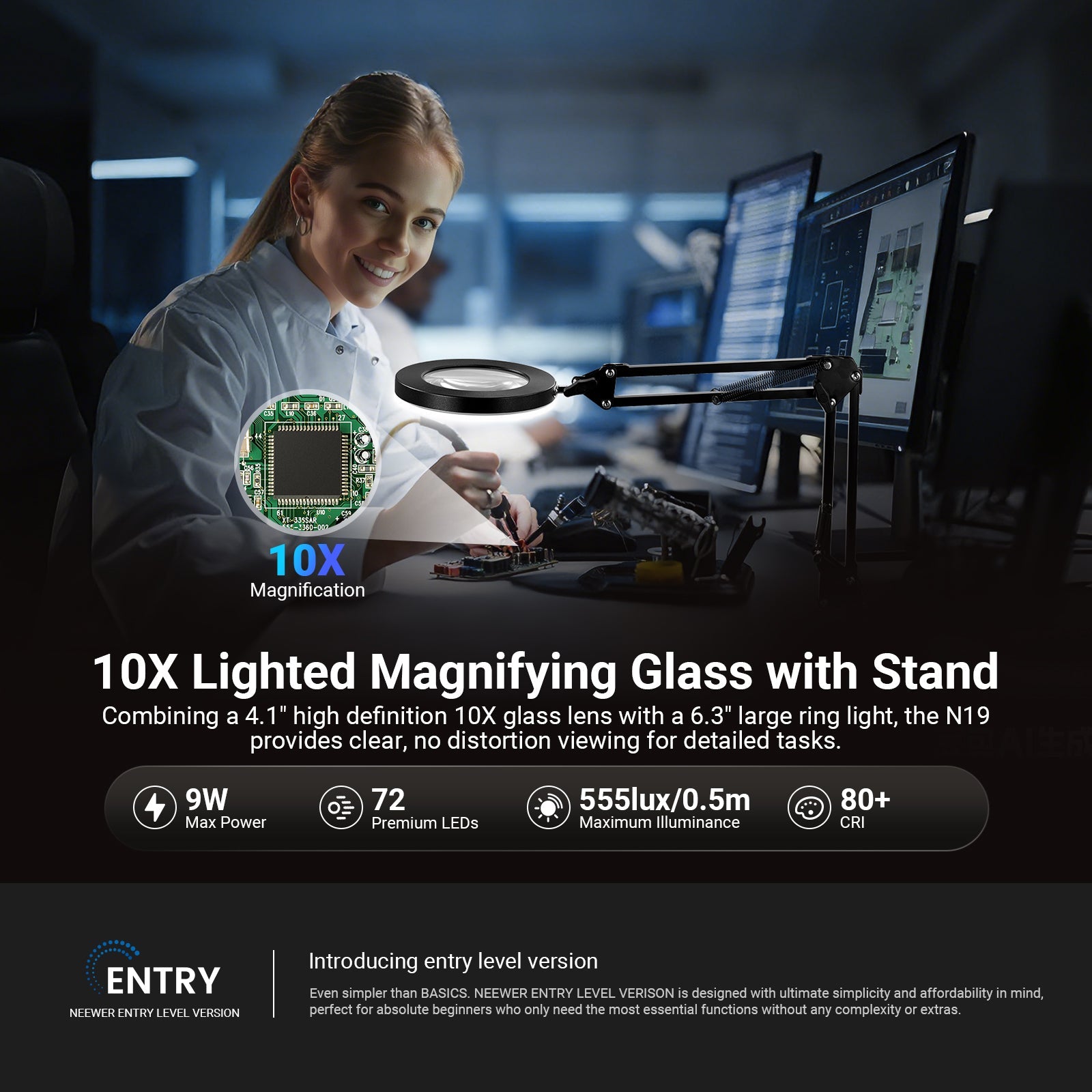 • 10X Lighted Magnifying Glass with Stand- Combining a 4.1" high definition 10X glass lens with a 6.3" large ring light, the N19 provides clear, no distortion viewing for detailed tasks. It ensures precision and ease for your fine work, reducing eye strain