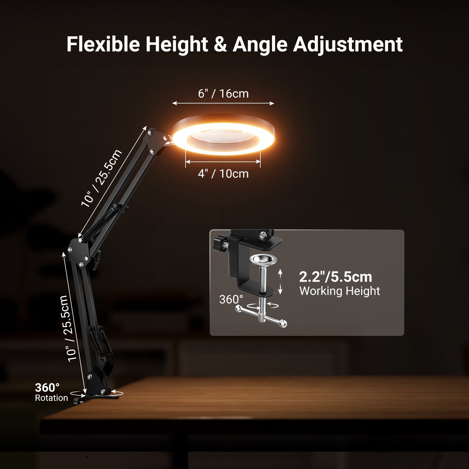 • Flexible Use- Featuring an articulating arm and swivel base, this desktop LED lamp extends up to 27.6"/70cm and enables flexible angle adjustment for close up observation or desk overhead lighting for filming & recording