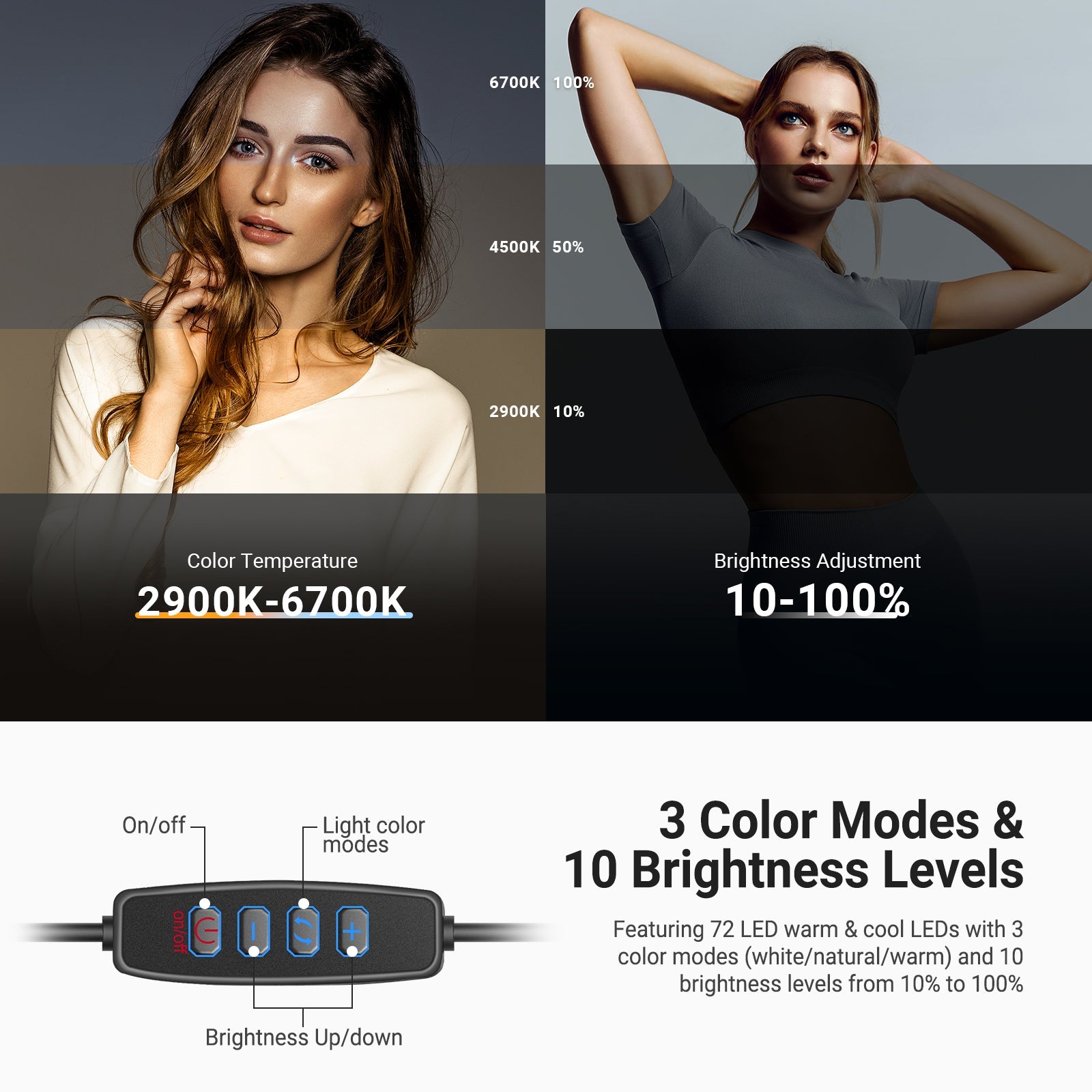 • Color Modes: Warm, Natural, Cool (2900K-6700K)
