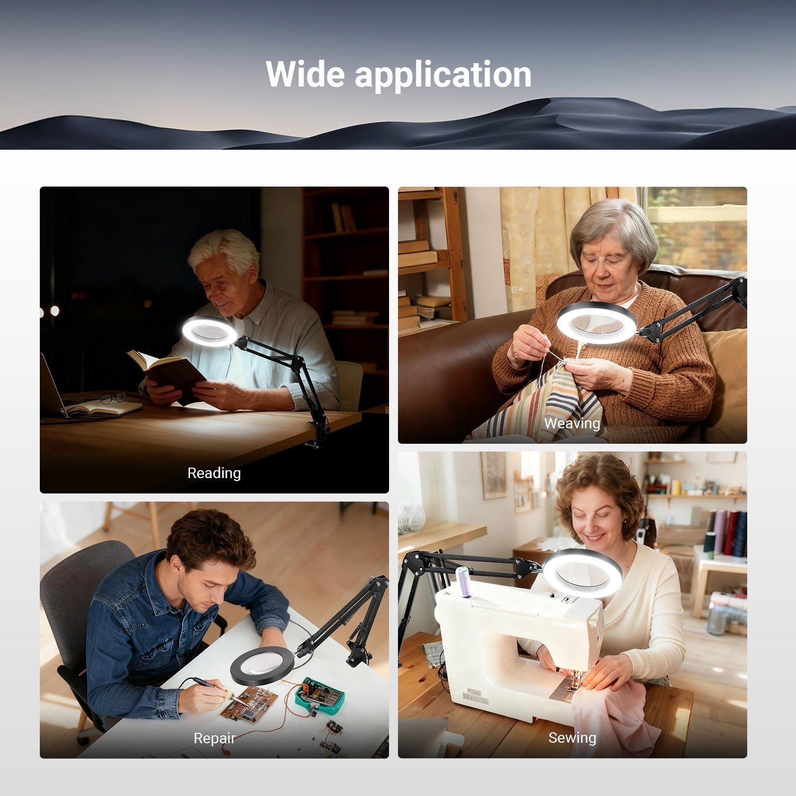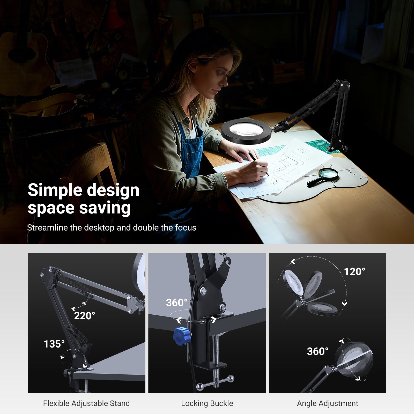 • Eye Caring Lighting- The practical N19 clip on ring light with magnifying glass delivers soft, stable, eye friendly illumination with no glare for desk crafts, reading, jewelers jewelry making, sewing, nail tech, repairs, drawing, knitting, even for seniors reading. The clamp on setup & onboard buttons are easy to operate