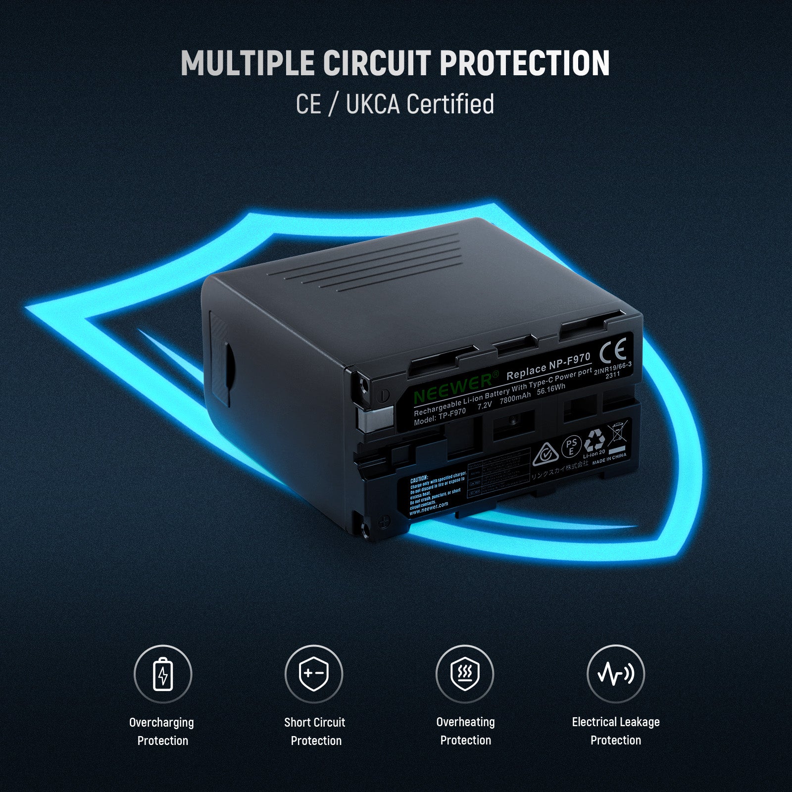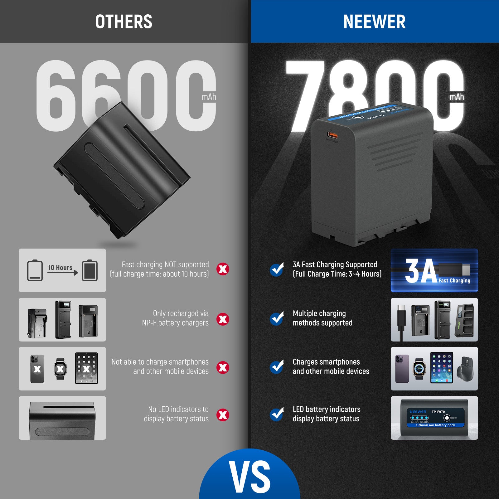 • Upgraded Higher Capacity Replacement Battery- NEEWER TP-970 rechargeable lithium battery features a high capacity (7.2V 7800mAh 56.16Wh) and offers a longer battery life than common NP-F batteries. Manufactured with premium cells, it can provide you with abundant and consistent battery power for capturing every wonderful moment in life