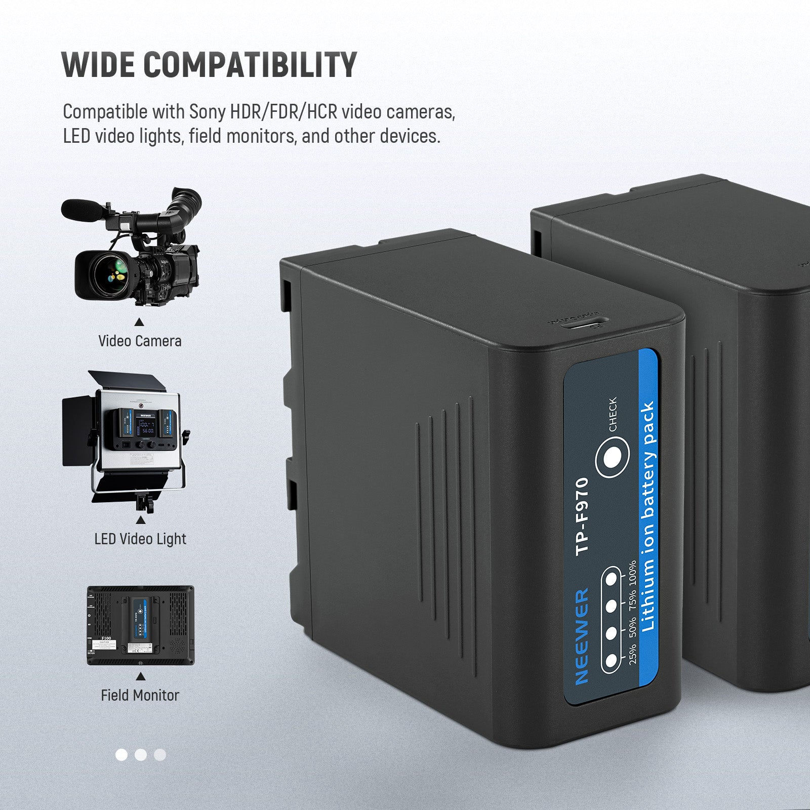 • Extensive Compatibility- A replacement for all NP-F series batteries, including NP-F550 NP-F570 NP-F750 NP-F770 NP-F960 NP-F970 NP-F975. Compatible with Sony cameras and camcorders such as CCD-RV CCD-SC CCD-TR CCD-TRT CCD-TRV CVX DSR DCR GV HDR HVL HVR MPK MVC PBD PLM series, NEEWER LED panel lights, ring lights, and field monitors