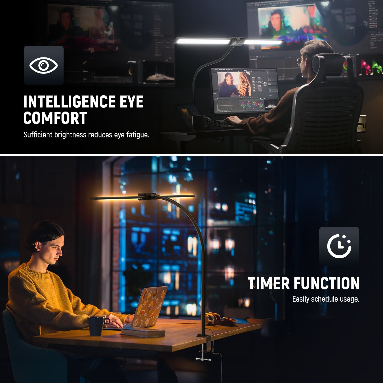 - 32" Extended Dual Light Bars for Wide Coverage- NEEWER N21 lamp for home office features 154 LEDs across two light bars, fully extending to 32"/81.2cm wide. It delivers up to 2200lux/0.5m, offering broad, even, and eye friendly overhead illumination that covers 2 computers simultaneously, with ample brightness to highlight every detail while reducing eye strain. The light bars tilts up & down for a broader or more focused light spread, ideal as key or fill lighting for desk designing/drafting