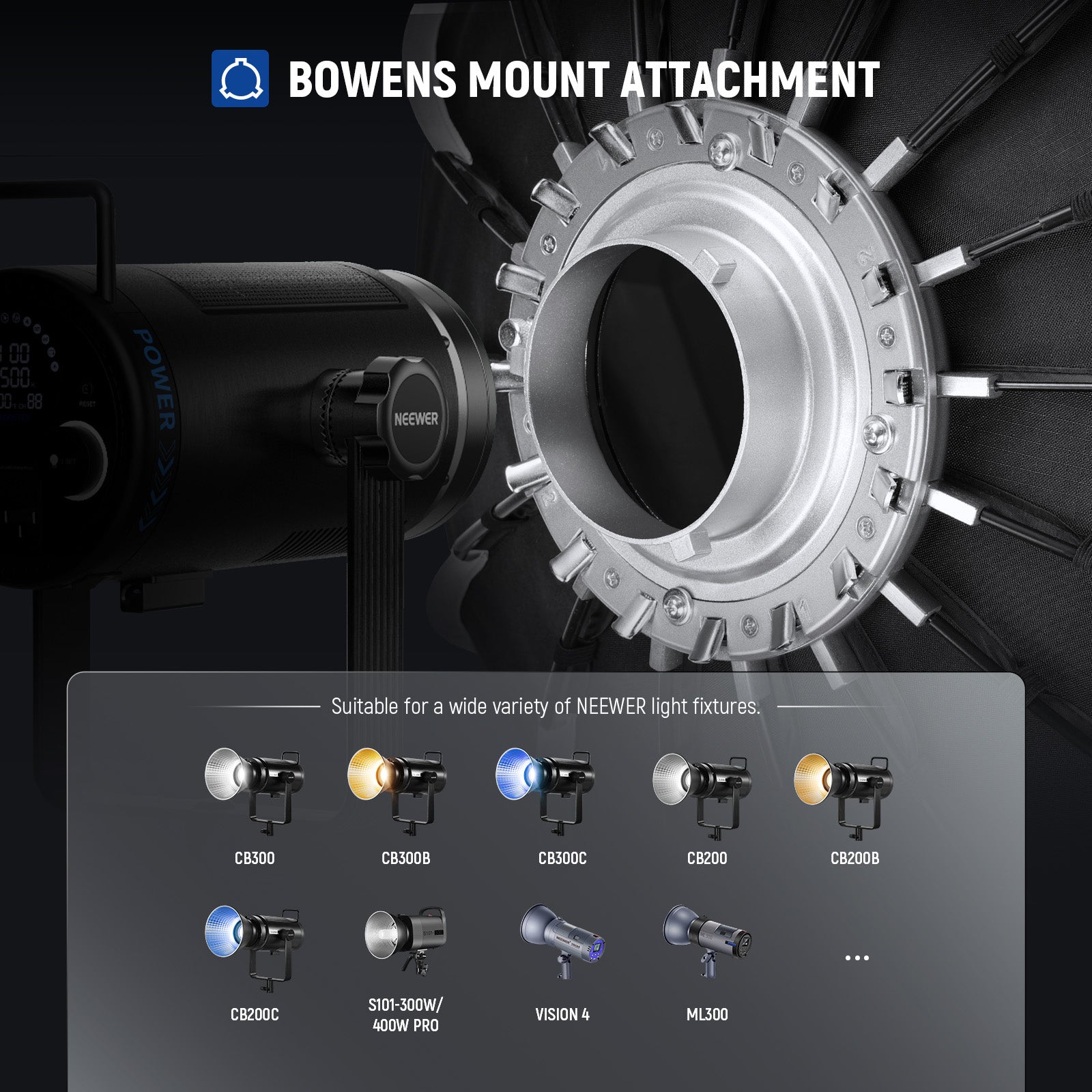 - Attach Via Bowens Mount- Connecting via Bowens mount, the softbox is compatible with Aputure 120d Godox sl60w NEEWER CB150, CB100, CB60, RGB CB60, SL-70W, S101-300W PRO, S101-400W PRO, Vision 4, Vision 5, and other studio strobe lights and continuous LED video lights with bowens mount