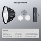 - Quick Release & Quick Fold Structure- 16 highly resilient ribs give this softbox incomparable durability and an impeccable parabolic shape that can withstand tens of thousands of presses without deformation for years of use. The quick release design allows you to set the softbox up in less than 15 seconds without any tool. Foldable and merely 3.3lb (1.5kg) in weight, the softbox is easy to store and transport inside the included carrying bag