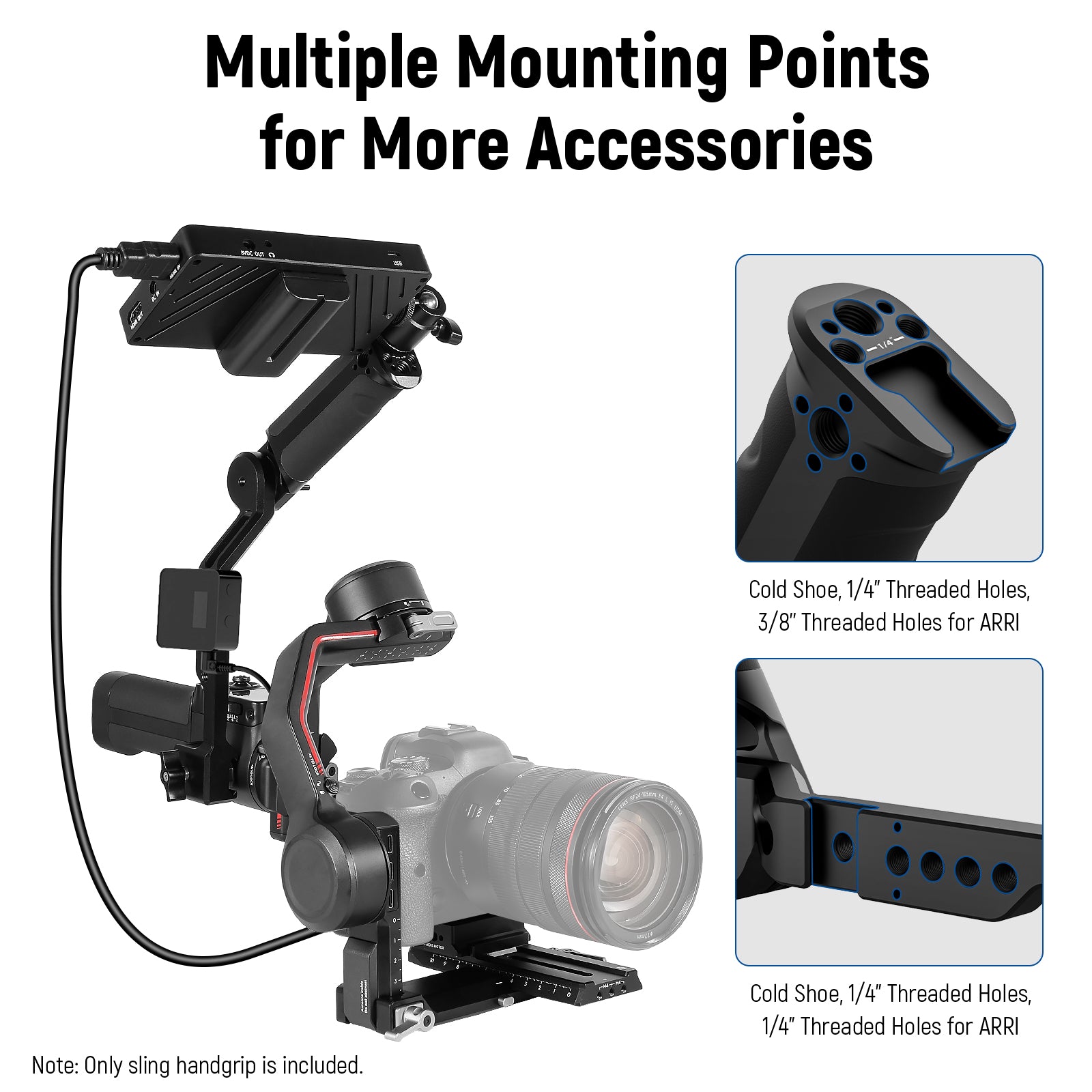 - Multiple Expansion Options- The sling grip comes with multiple 1/4" and 3/8" threaded holes, locating holes compatible with ARRI pins, and two cold shoe adapters to mount a wide range of accessories, including compatible with SmallRig NEEWER camera monitor mount for field monitor, NEEWER LED video light, sound receiver, and more