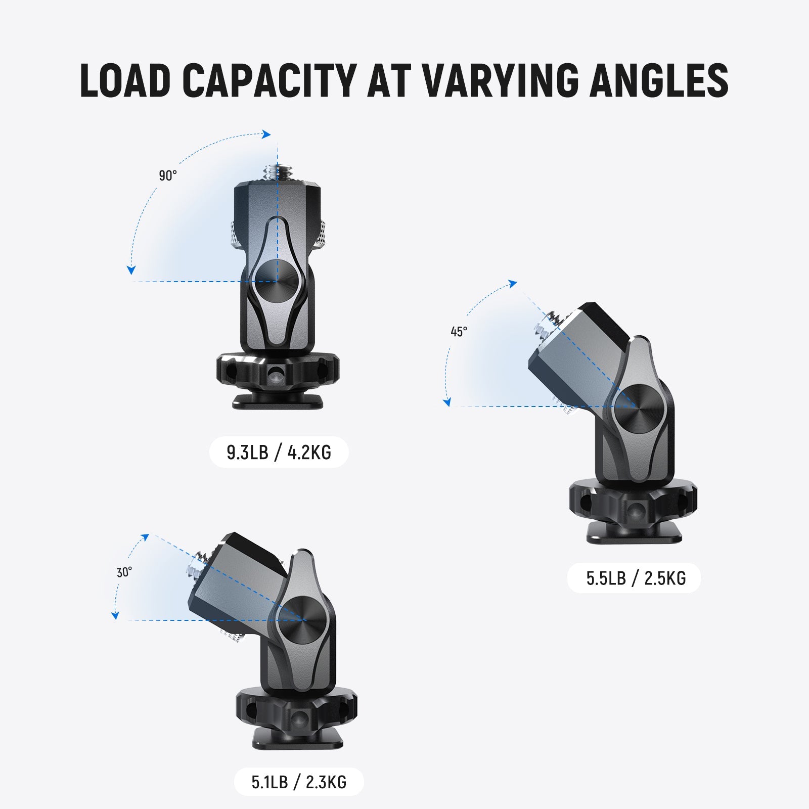 • Load Capacity at Varying Angles- Load capacity differs at varying tilted angles. Load capacity at 90°: 9.3lb (4.2kg). Load capacity at 45°: 5.5lb (2.5kg). Load capacity at 30°: 5.1lb (2.3kg)