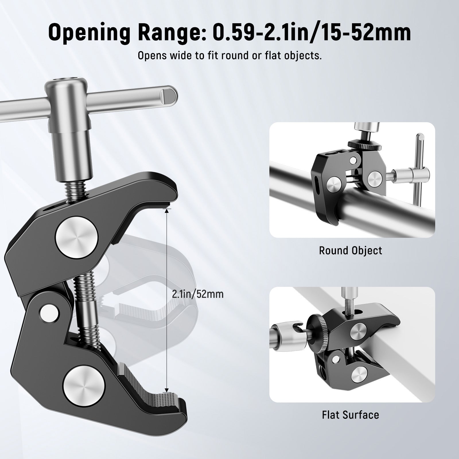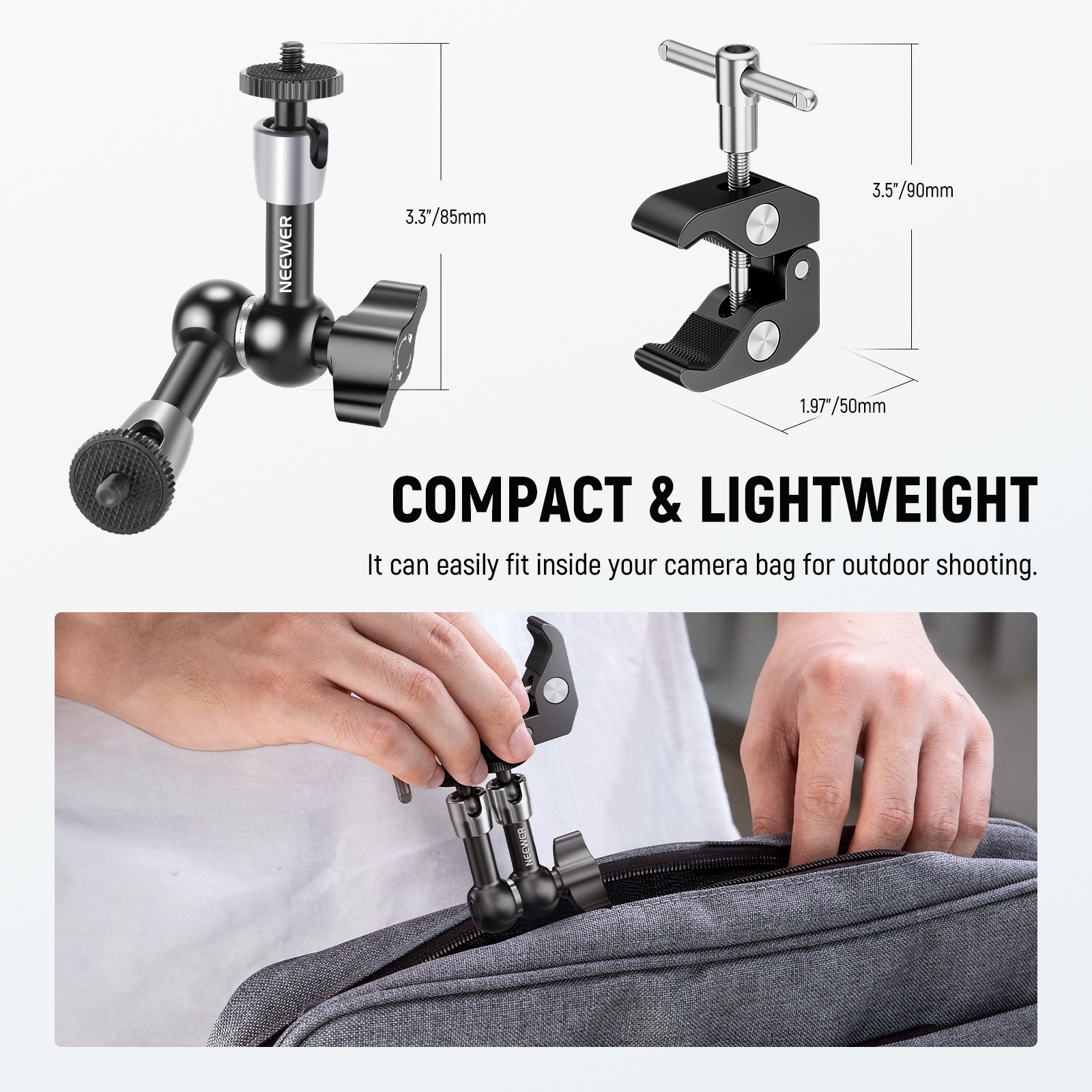 - Compact & Lightweight Kit- This kit contains a 6"/15cm magic arm and a super clamp with a 0.6"-2"/15-52mm opening for round and flat objects. Lightweight and compact, it can easily fit inside your camera bag for outdoor shooting