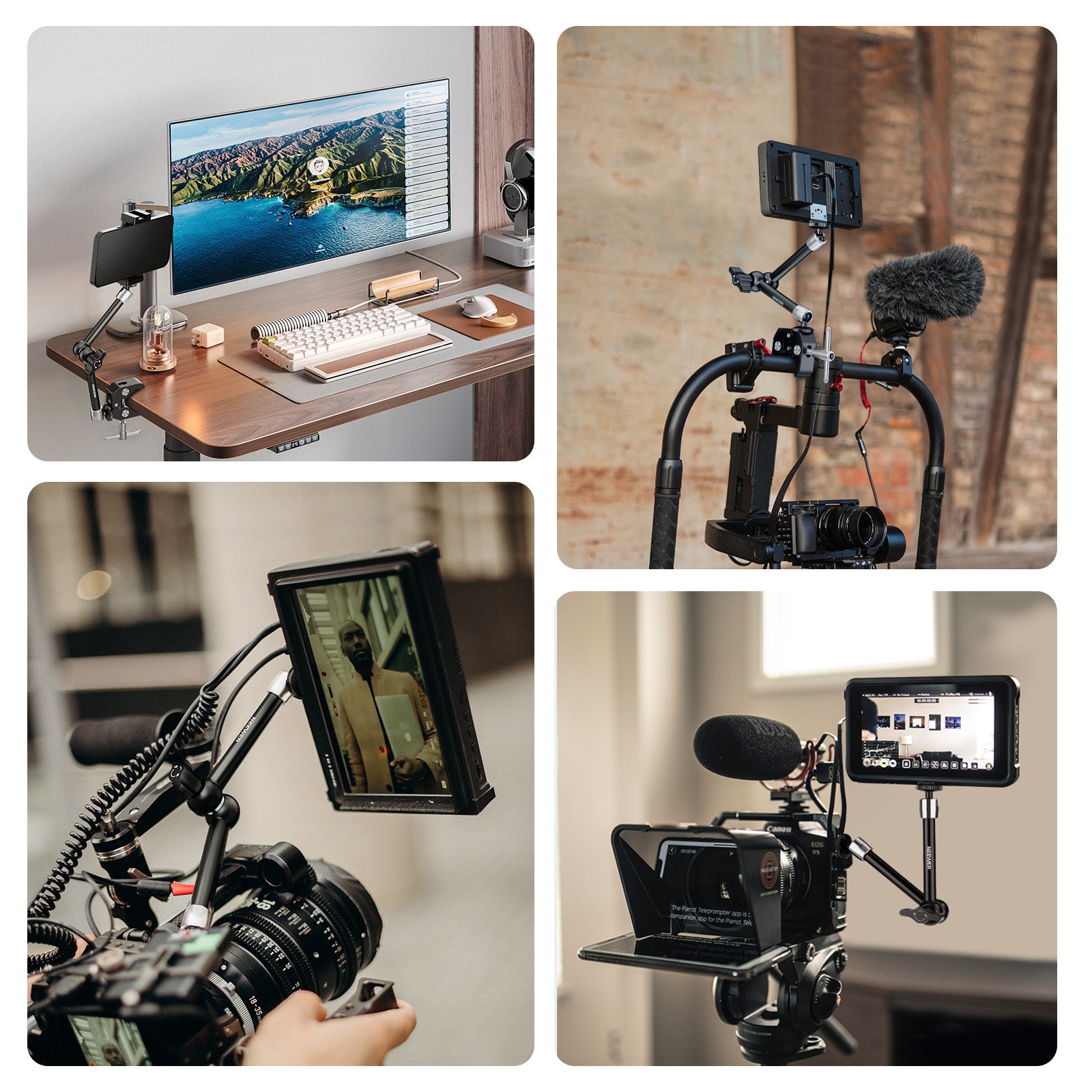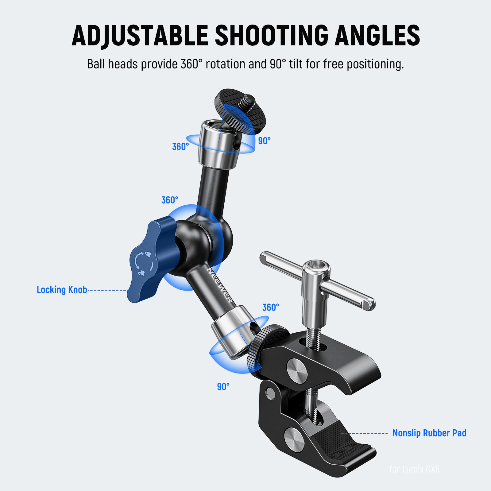 - Adjustable Shooting Angles- Ball heads provide 360° rotation and 90° tilt for free positioning. Use the locking knob to quickly fasten arms and ball heads at the same time