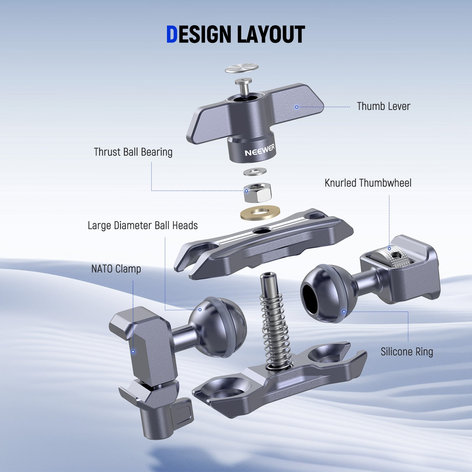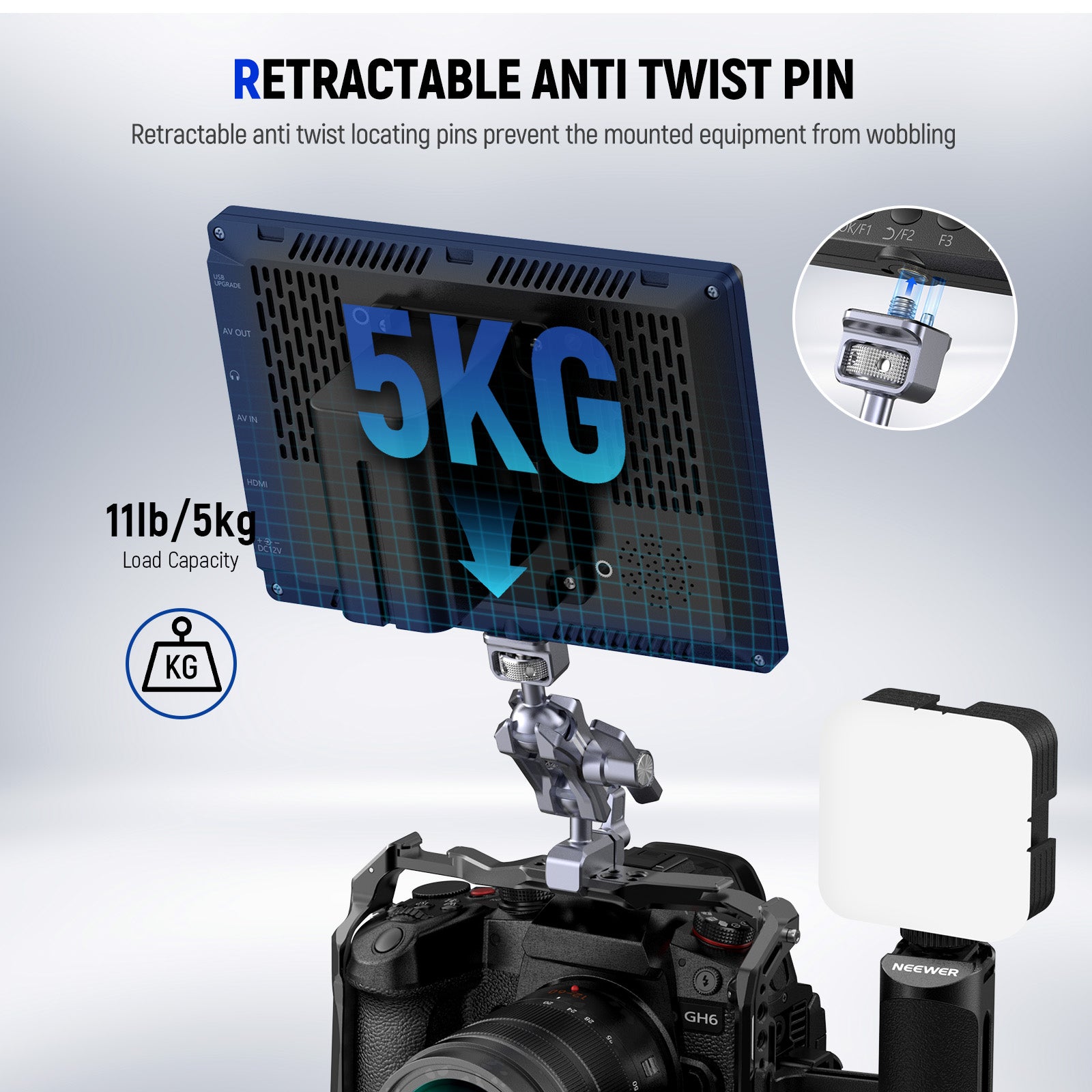 - NATO Clamp & 1/4" Screw- An NATO clamp can quickly connect to a camera cage (compatible with SmallRig and NEEWER) while a 1/4" screw can mount a range of devices up to 11lb/5kg, including field monitors, LED video lights, microphones, and action cameras