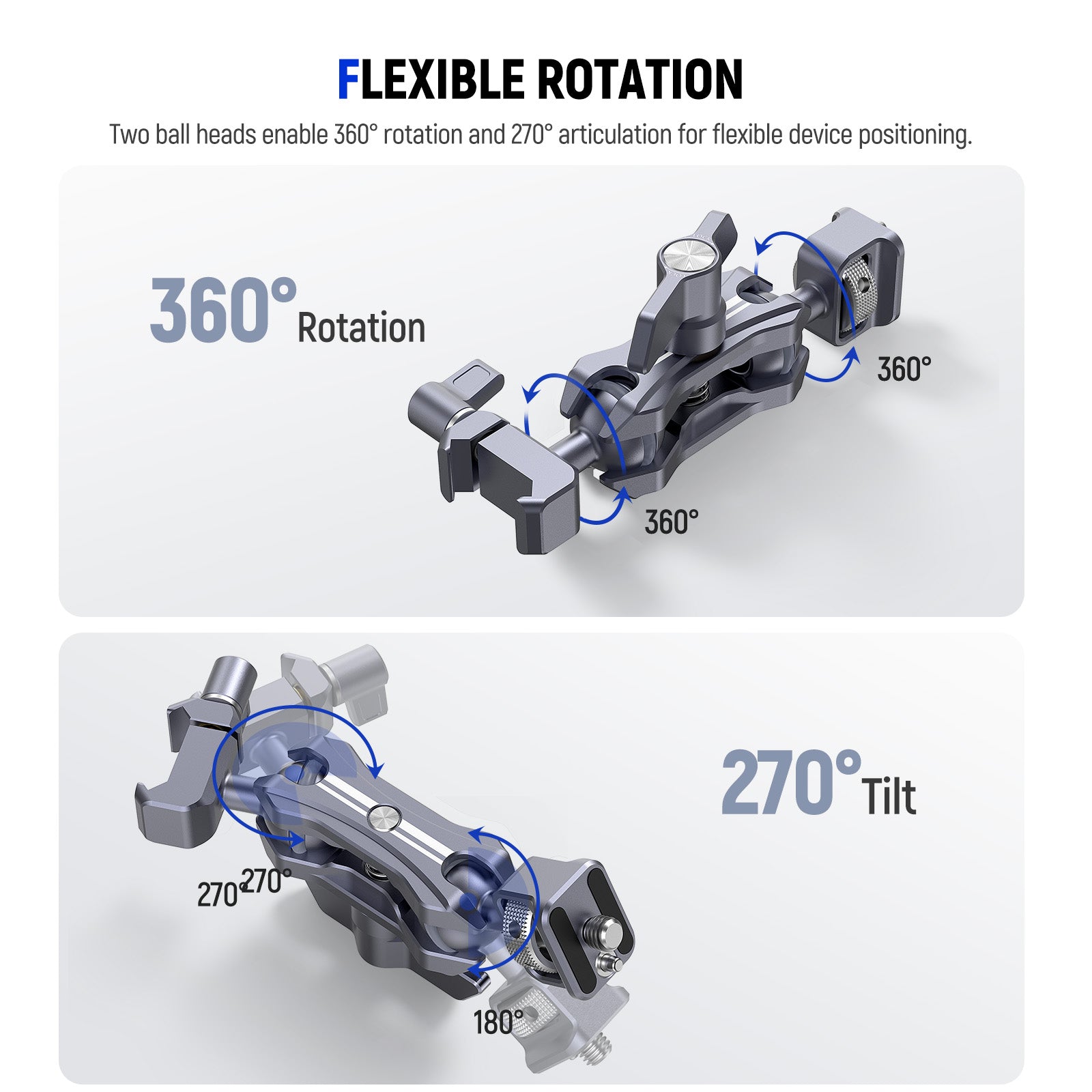 - 360° Rotation & 270° Tilt- This magic arm camera mount with two ball heads enable 360° rotation and 270° tilt for flexible positioning. Rubber rings increase friction for extra security