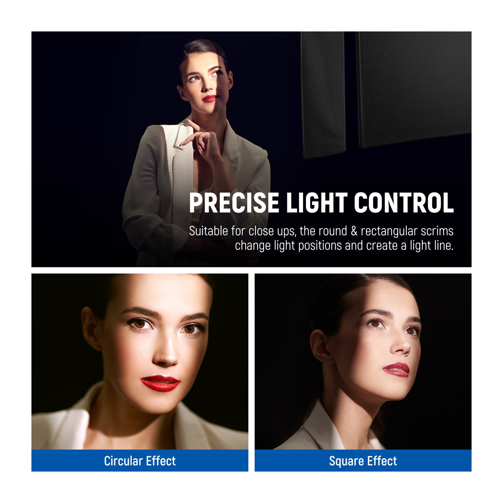 - Round & Rectangular Shapes- Two ø6" (16cm) round scrims (dots) and two 4"x14" (10x35.5cm) rectangular scrims (fingers) are suitable for small shooting environments. Their function is to finely adjust the light positions and prevent reflection, allowing photographers to accurately control the light and create dark shadows as well as bright highlights