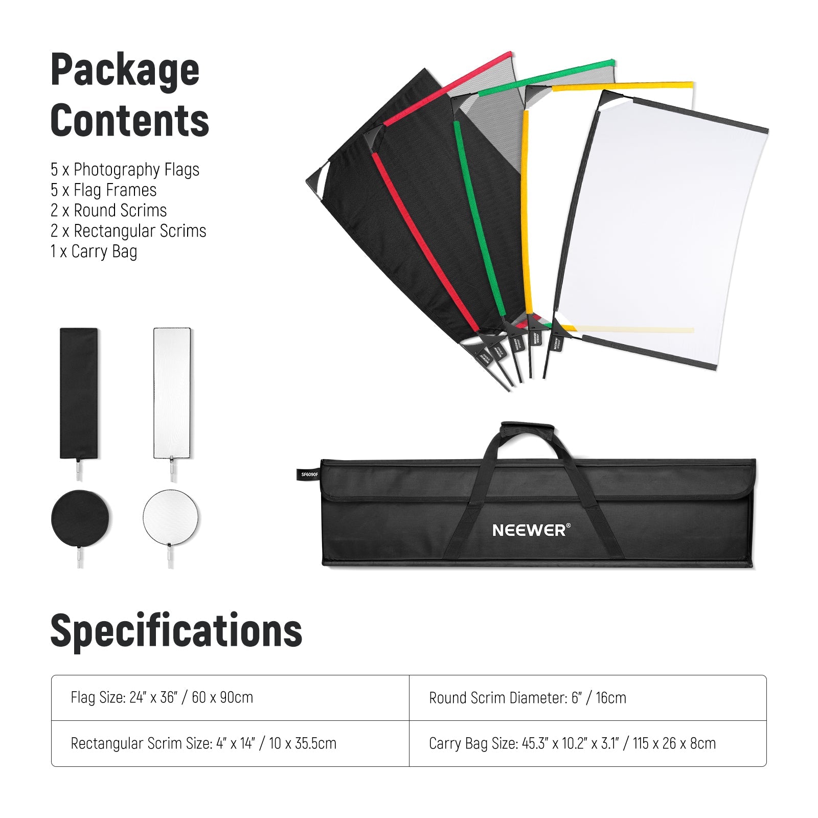 - Versatile Light Modifier Kit- With five detachable metal frames, five 24"x36" (60x90cm) photography flags, and four round / rectangular shaped scrims, this versatile light modifier kit allows photographers to combine the accessories and shape lights with unlimited creativity. The foldable frames and lightweight fabrics also make this kit easily portable
