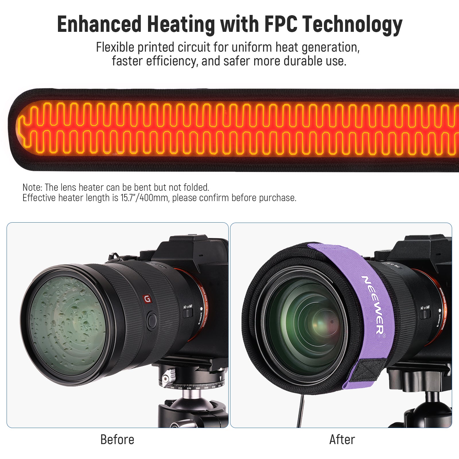 - Enhanced Heating with FPC Technology- Designed with FPC (flexible printed circuits), this lightweight yet durable lens heater uses polyimide films as the insulator for reliable dielectric performance, and thermofoil as the heating element for improved thermal conductivity and higher heat transfer efficiency to quickly and evenly warm up your lens. Note: The lens heater is bendable but cannot be folded