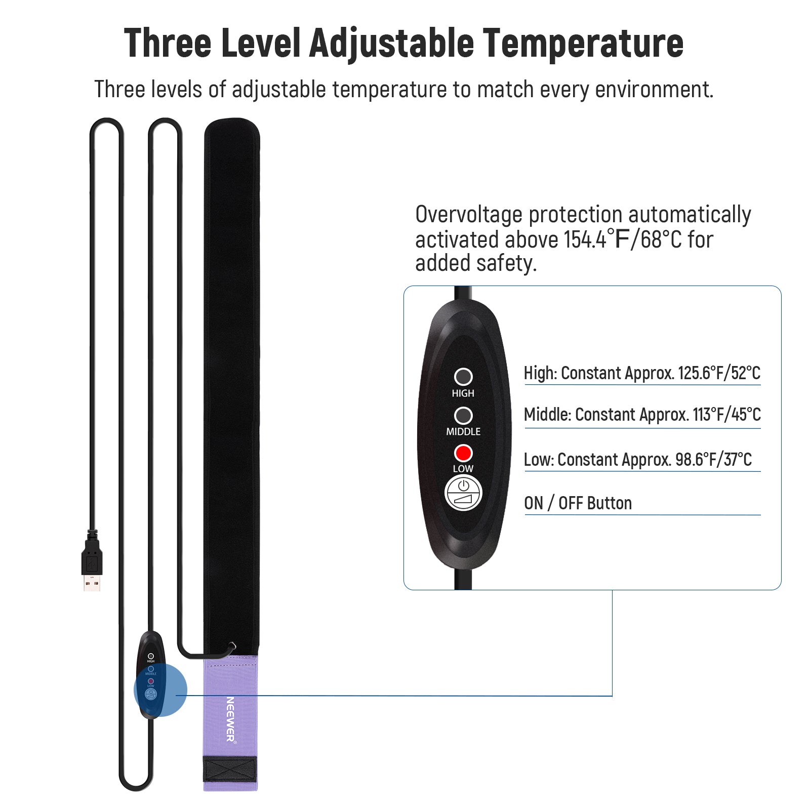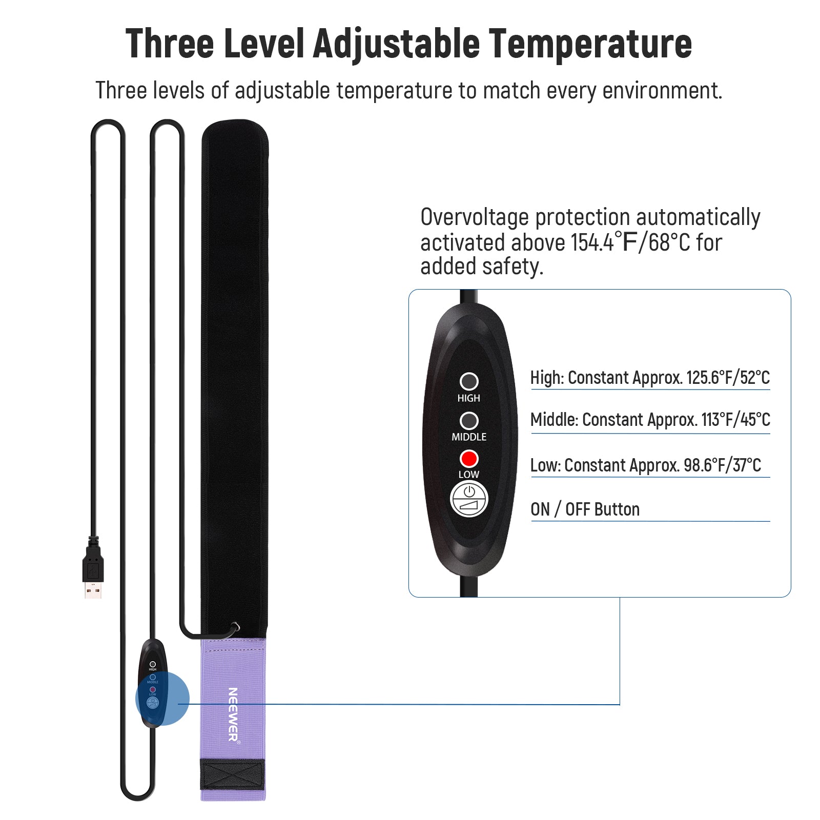 - Safe 5V 2A USB Power Supply- Through the 6ft/1.8m USB cable, the lens heater can receive power from any USB power source with a 5V 2A output and feature overheating/overvoltage protection for safe use. A regulator offers 3 temperature levels (High: 125.6°F/52°C; Mid: 113°F/45°C; Low: 98.6°F/37°C) for different environments