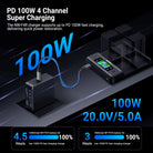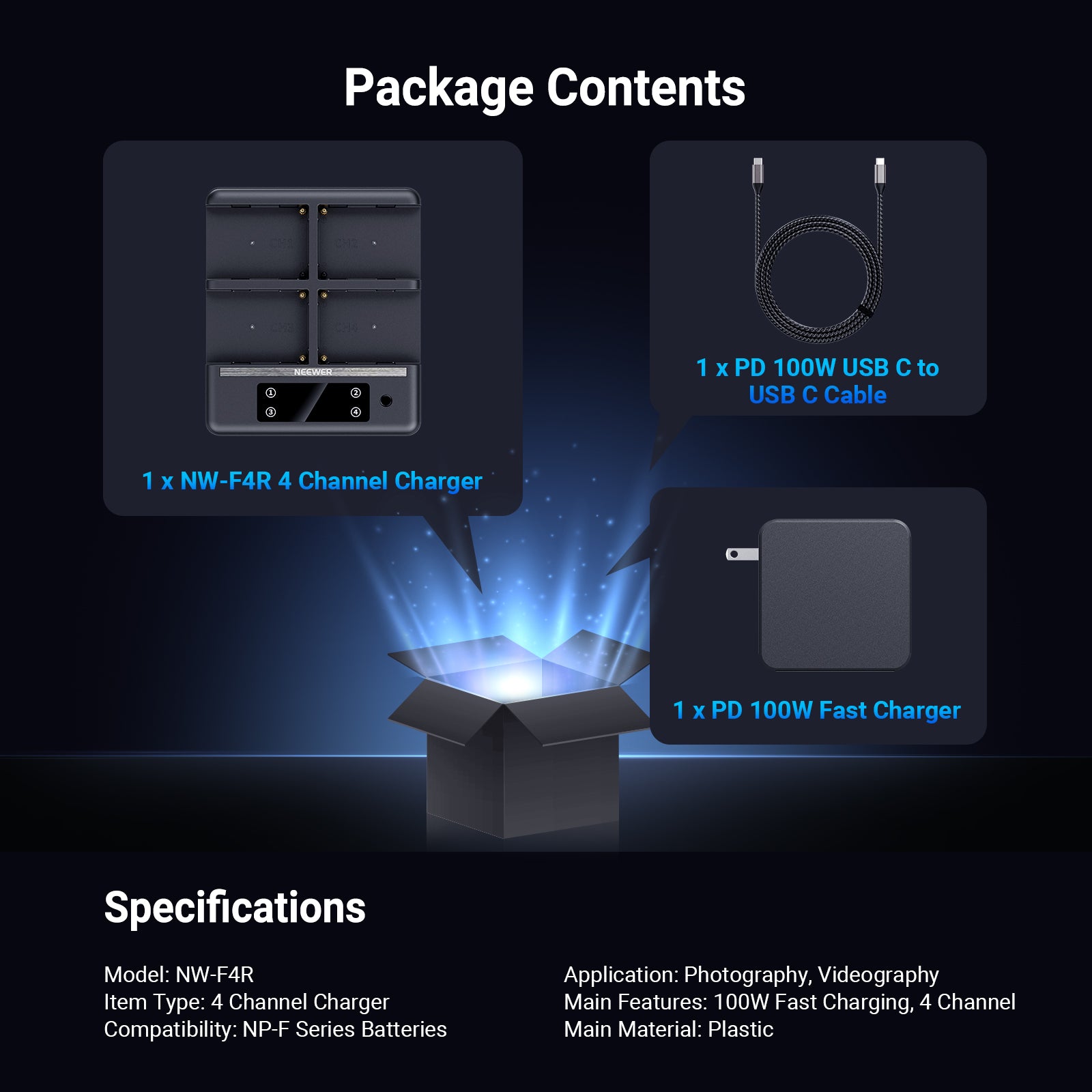 - PD 100W 4 Channel Fast Charging- The NW-F4R charges up to 4 NPF batteries at once. It supports PD 100W ultra fast charging when used with a 100W PD charger (sold separately), having four 10500mah NP-F970 batteries fully recharged in 4.5H, or four 7800mah NP-F970 batteries in 3H. With a current detection switch, it auto adjusts between the two output levels based on the battery model for optimal charging efficiency. Note: To achieve full power output, a PD 100W charger or higher is required