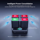 - Intelligent Power Consolidation- When this function is enabled and at least two batteries are inserted, the charger automatically identifies power levels and transfers energy from lower charged batteries to the higher charged one, ensuring concentrated power in a single battery for critical moments. Long press the function button to activate it. Note: While active, the USB C output will be automatically disabled