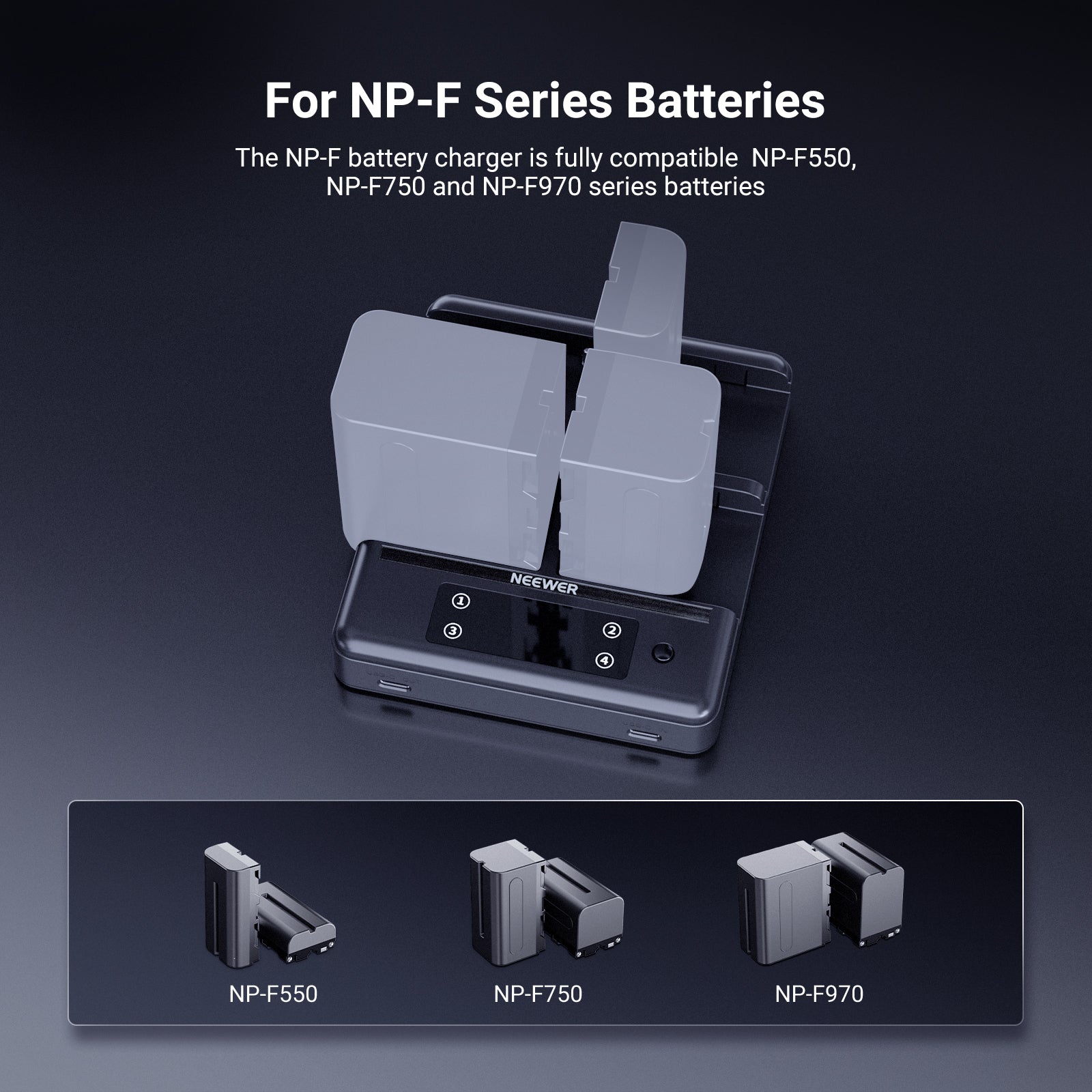 - For NP-F Series Batteries- The NP-F battery charger is fully compatible with Sony NP-F550 NP-F750 NP-F970 series rechargeable batteries, providing a versatile power solution for various cameras, camcorders, and photography lighting equipment as content creator essential accessories and influencer must have gear