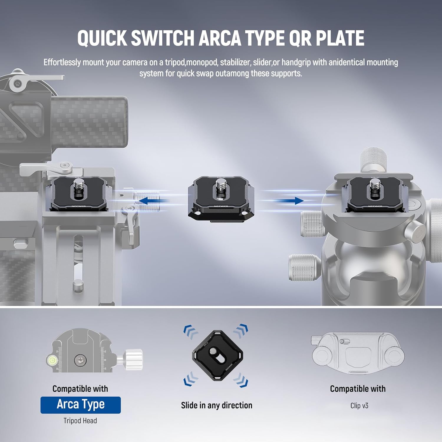 - Quick Switch Arca Type QR Plate- Effortlessly mount your camera on a tripod stand, monopod, stabilizer, slider, or handgrip accessories with an identical mounting system, and ensure quick swap out among these supports. Compatible with arca swiss 38mm plate clamp base, compatible with camera backpack shoulder strap clip. NOT compatible with Ulanzi Falcam F38 DJI gimbal stabilizer