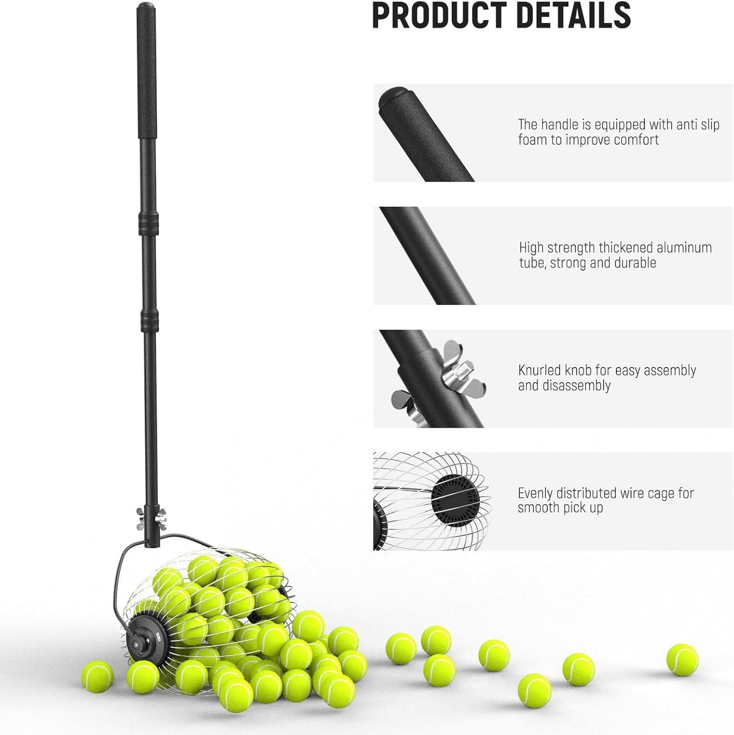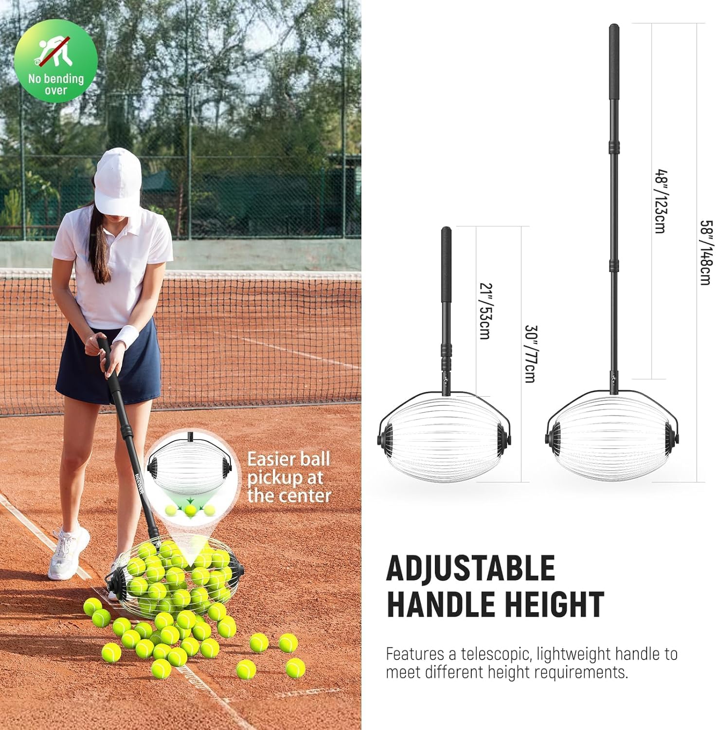 - Adjustable & Comfortable for All- With a 30"-58" (77-148cm) adjustable telescopic aluminum handle, this tennis ball picker is for users of all heights. The ergonomic foam grip with a soft and nonslip hold can reduce hand strain during extended use for maximum comfort and efficiency
