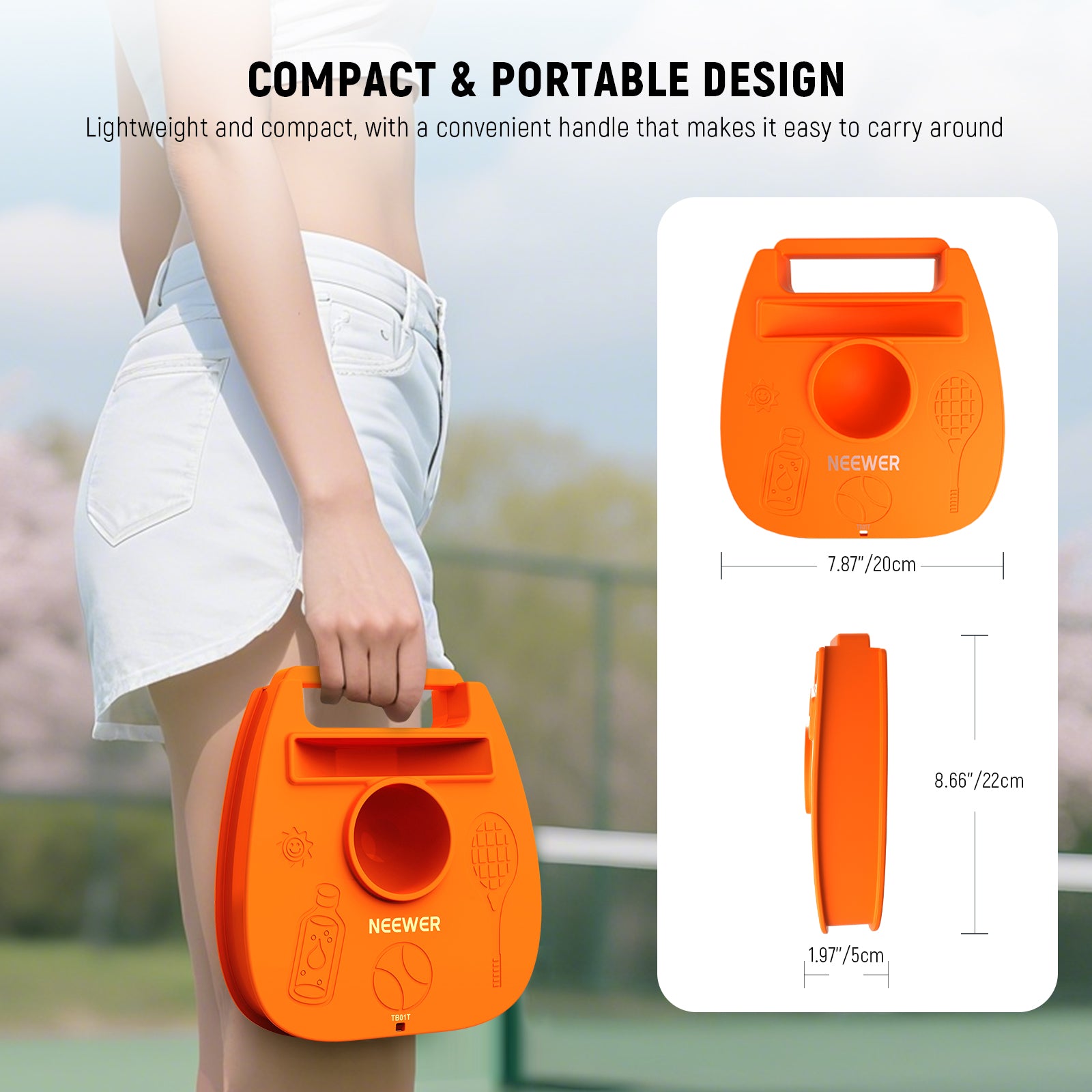 • Ergonomic Design- The base features a vibrant orange color for easy visibility. It includes an integrated racket holder that securely fits most standard rackets, along with a ball storage slot to keep your gear neat, organized, and within reach while you take a break