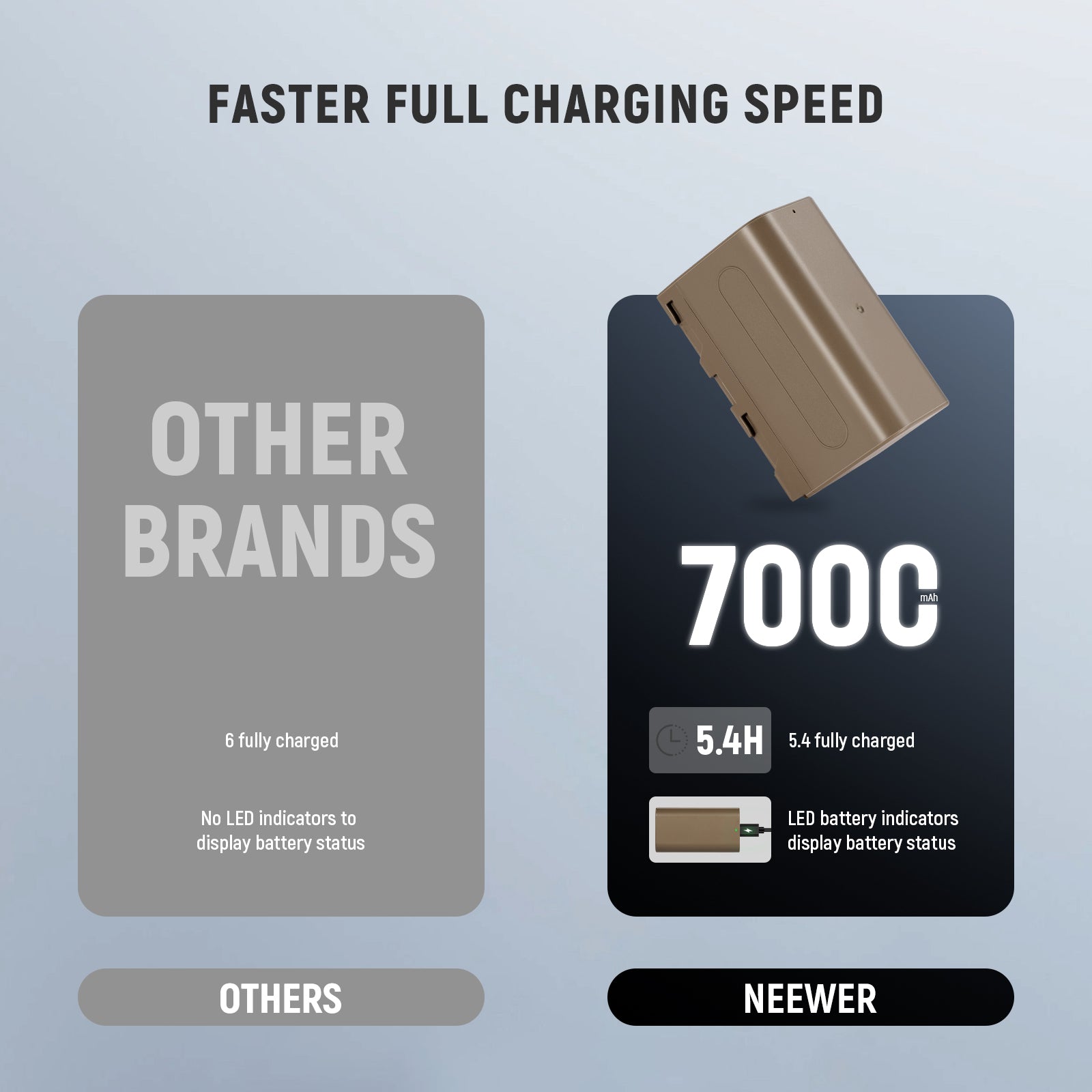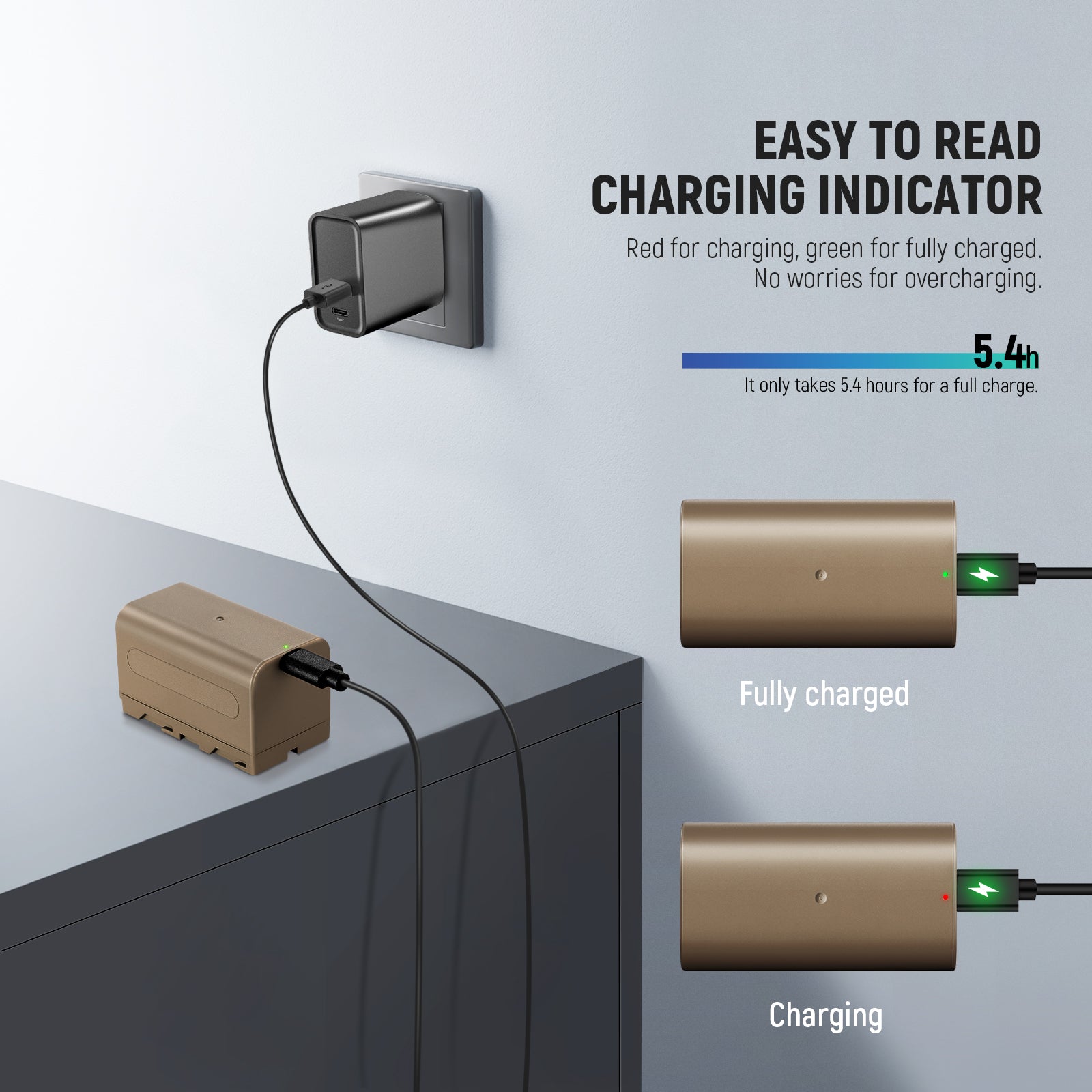 - Faster Full Charging Speed- This NP-F battery can be fully charged in 5.4 hours with a 5V 2A USB wall charger, much faster than 27 hours when using the original battery charger. Note: PD fast charging is not supported, wall charger adapter is not included