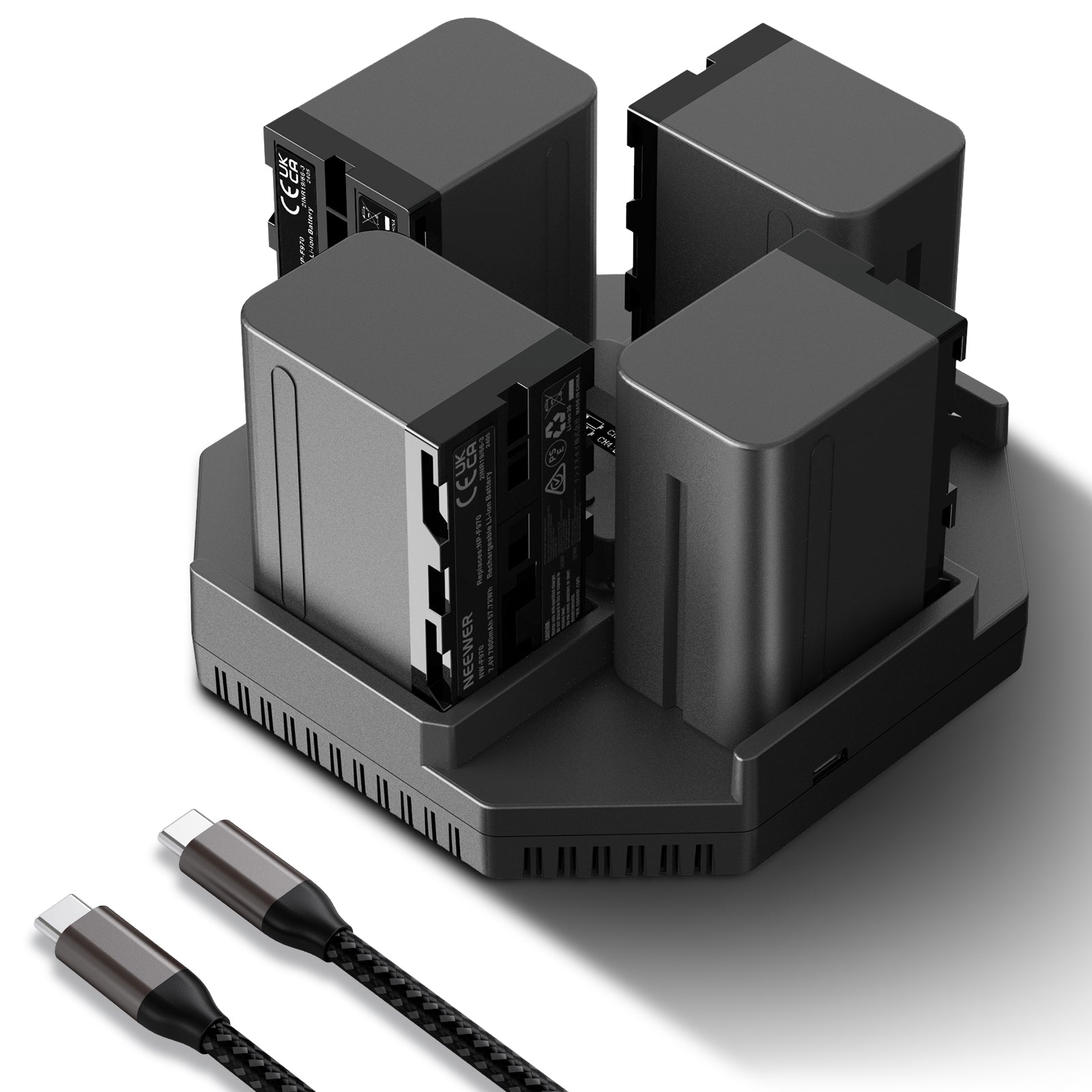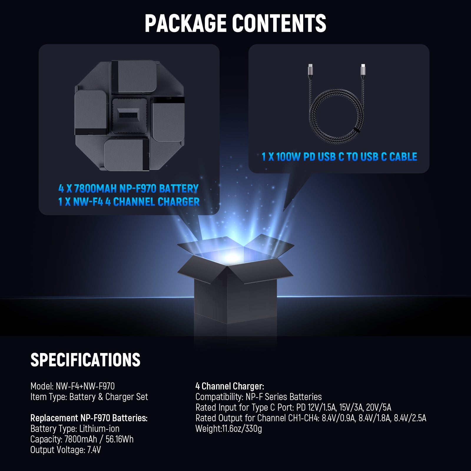 - 100W PD 4 Channel Fast Charging- The NW-F4 efficiently charges up to 4 NPF batteries simultaneously. It supports 100W PD ultra fast charging when used with a 100W PD charger (sold separately), having four 10500mah NP-F970 batteries fully recharged in 4.5H, or four 7800mah NP-F970 batteries in 3H. Note: To achieve full power output, it’s highly recommended to use a 100W PD charger or higher. A 100W PD USB C to USB C fast charging cable is included