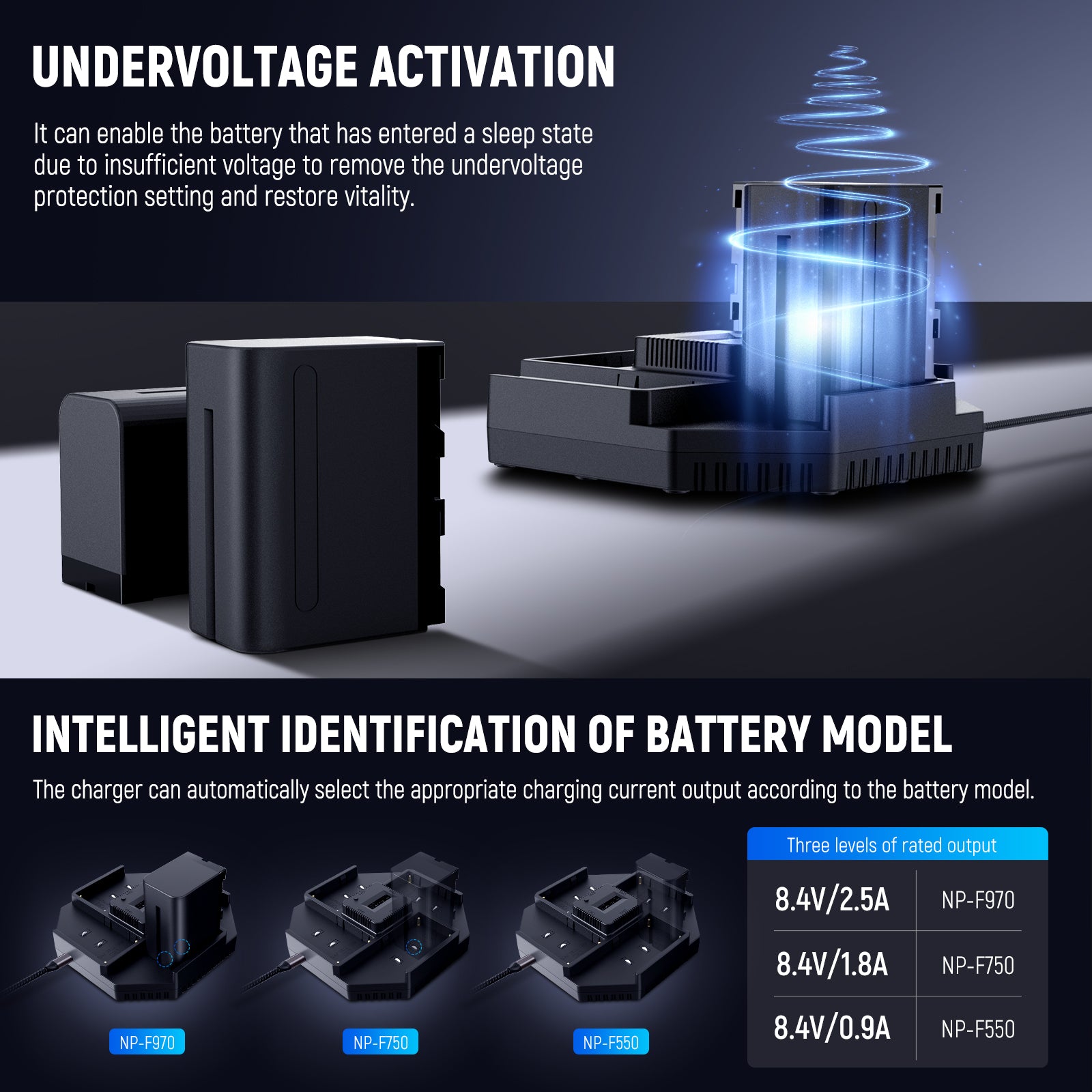 - Fully Compatible with Sony NP-F Series Batteries- The NP-F charger seamlessly accommodates NP-F550, NP-F750, and NP-F970 series batteries, with each channel featuring 3 levels of rated output: 8.4V/0.9A, 8.4V/1.8A, 8.4V/2.5A. With a current detection switch, it automatically switches between the three output levels based on the specific battery model, achieving optimal charging efficiency