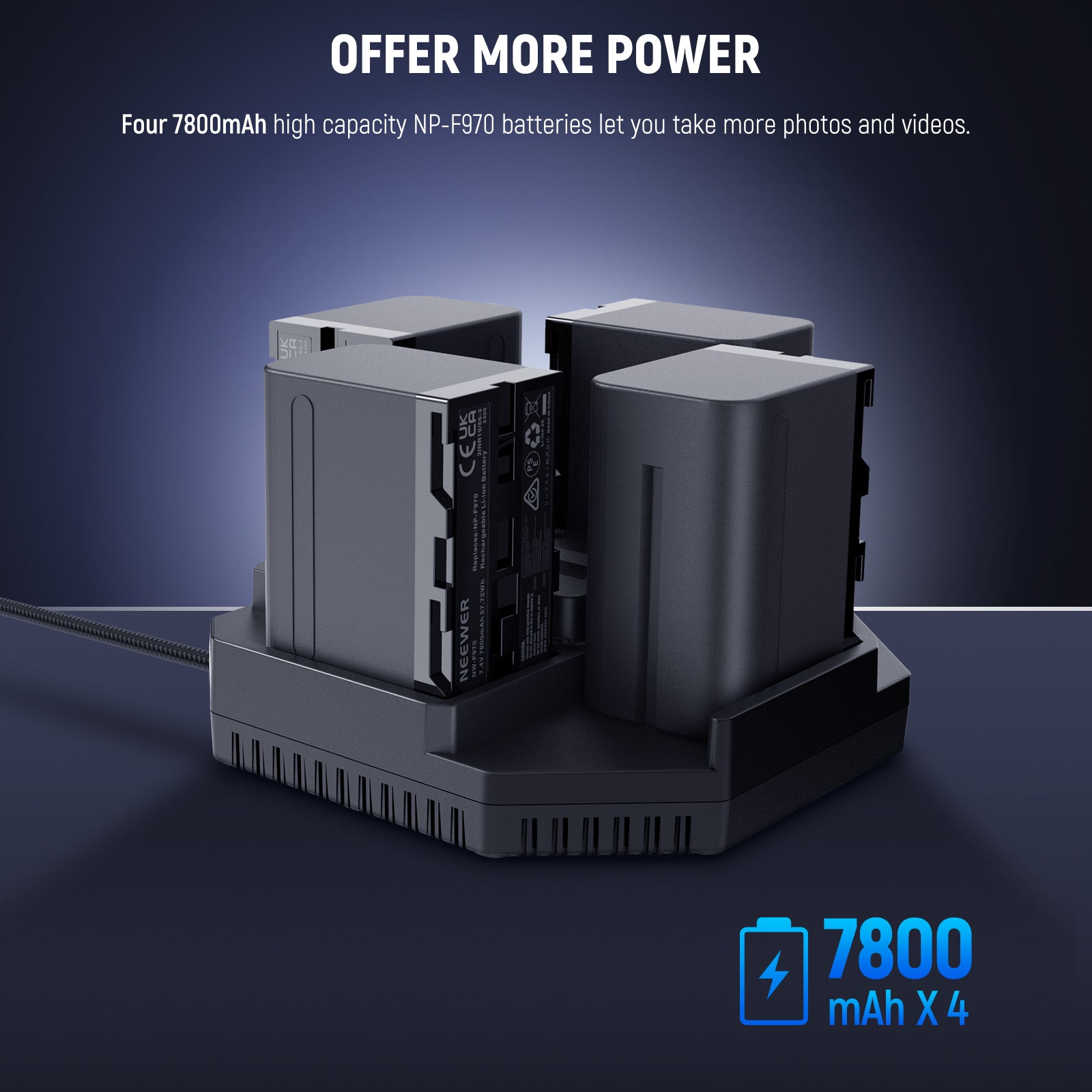 - 4PCS Upgraded 7800mAh Replacement Batteries- NEEWER NP-F970 rechargeable lithium battery features a higher capacity (7.2V 7800mAh 56.16Wh) and offers a longer battery life than the original NP-F batteries. Manufactured with premium cells, it can provide you with abundant and consistent battery power for capturing every wonderful moment in life