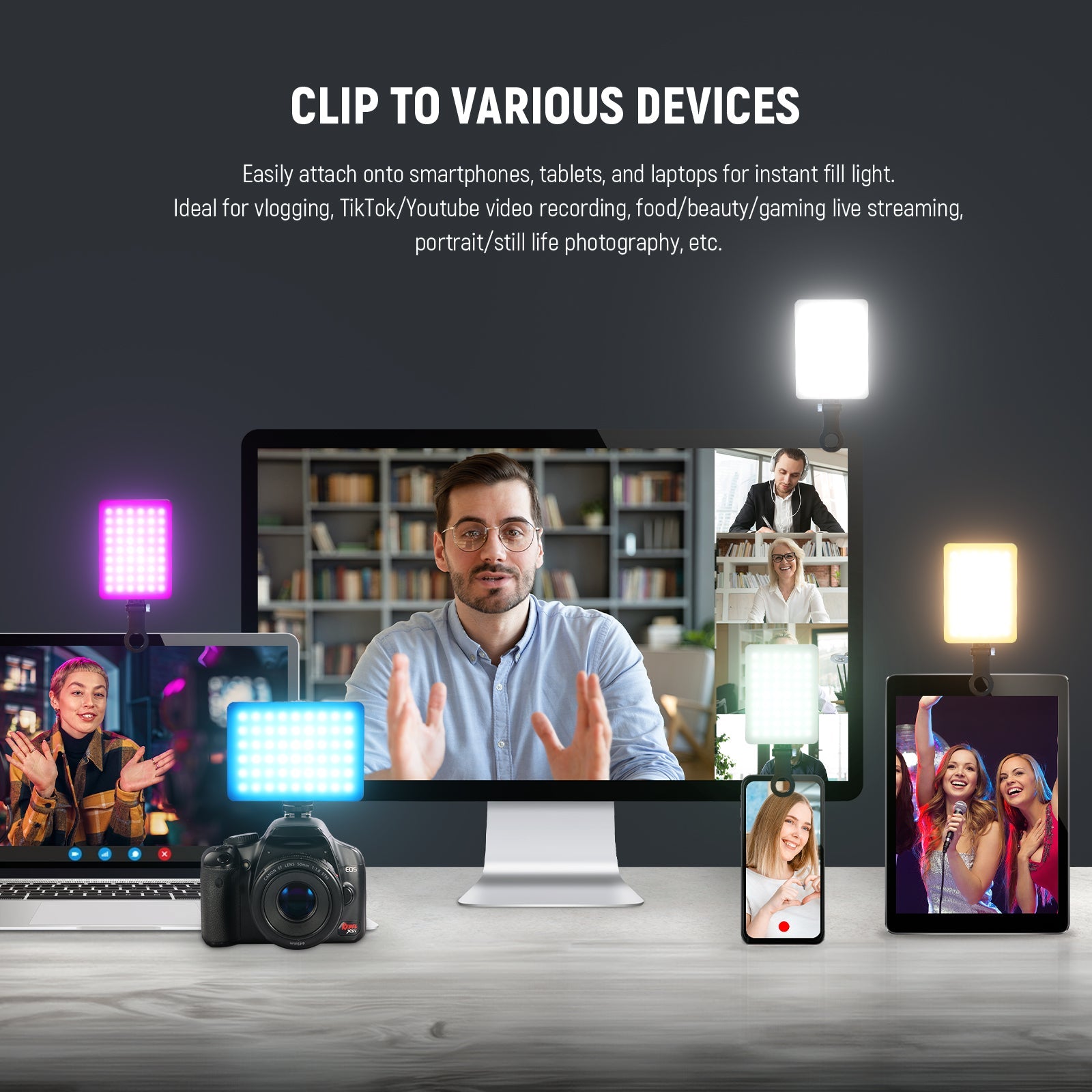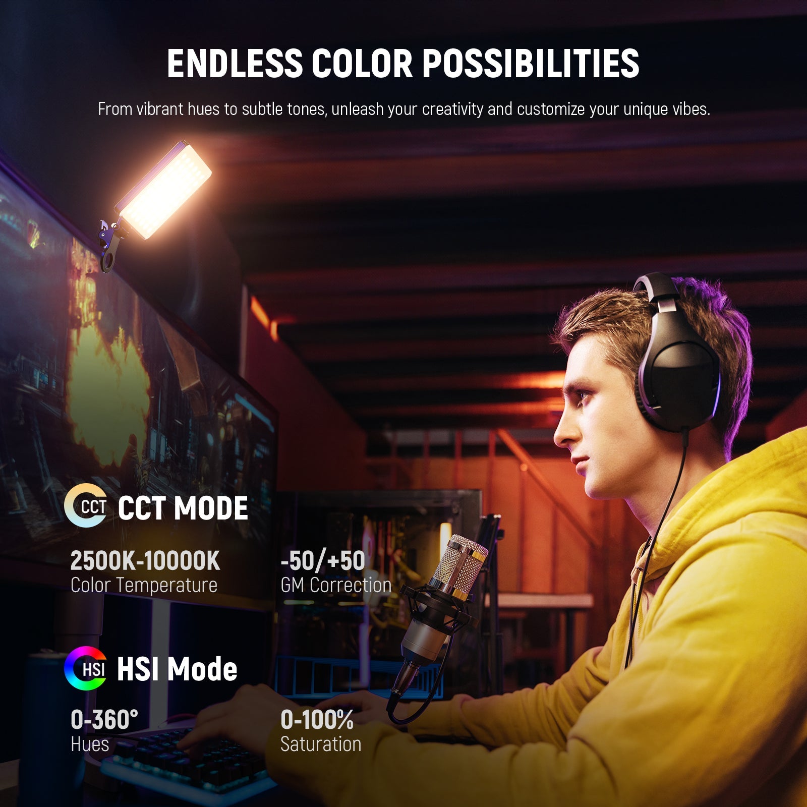 - Powerful & Versatile Full RGB Color- With 94 powerful LED beads, this 5W full color RGB light delivers a max illuminance of 450lux at 0.5m and impressively offers up to 36,000 color choices, with a 97 high CRI for more accurate color rendition without flicker or glare. Perfect for selfies, vlogging, food/beauty/gaming live streaming, TikTok/Youtube video recording, portrait/still life photography, etc. Recommended fill light distance: 4.9"/1.5m