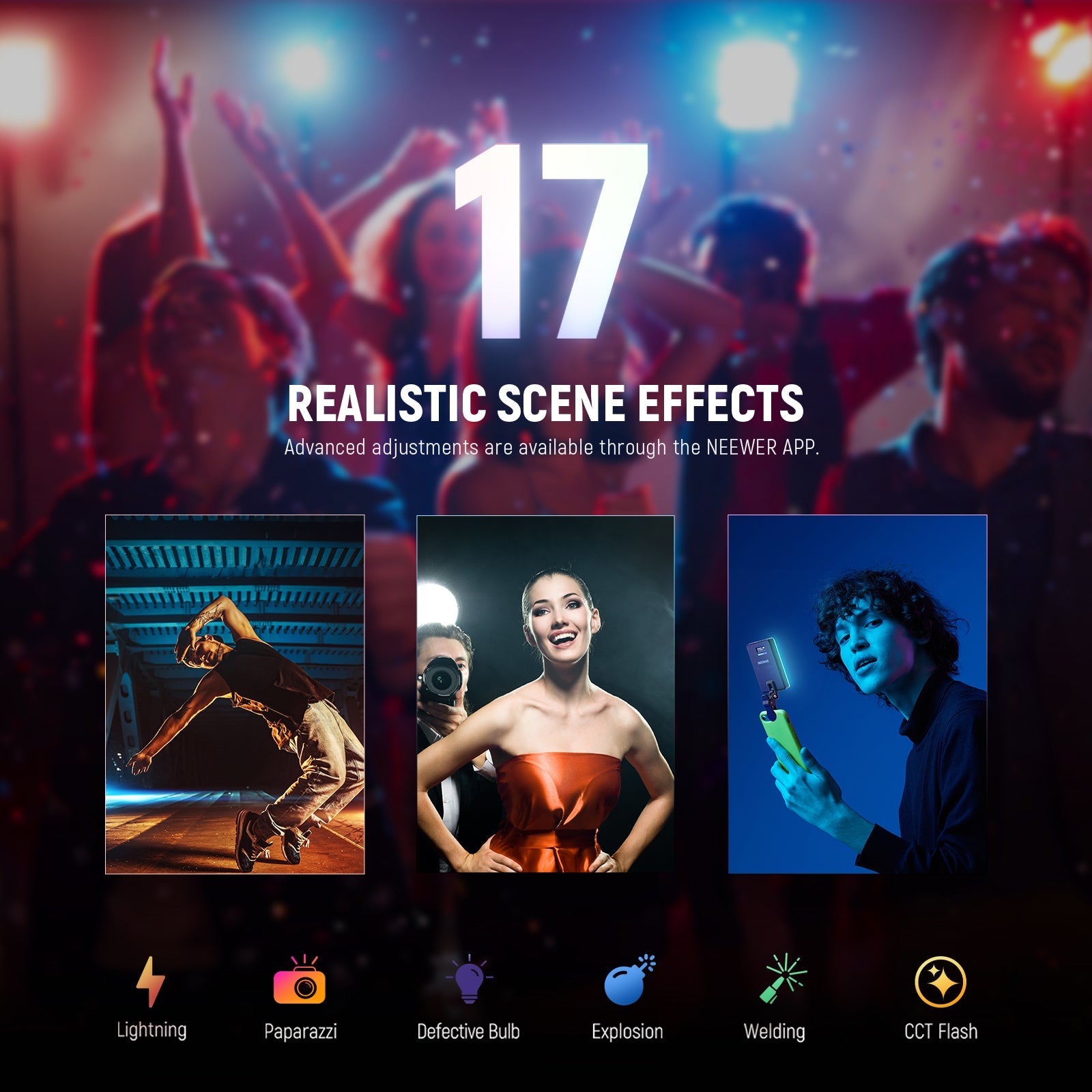 - Portable RGB Video Light with Smart App Control- Upgraded with the advanced Bluetooth module for wireless control over single or multiple LED lights via the NEEWER APP on your phone, and unlock smart functions like RGB Mode, Music Sync, Light Source Library, Color Matching, Preset Color Temperature, Color Picker functions, and Parameter Memory for quick lighting setup. At 0.24lb/108g and 0.58"/1.48cm thick, this selfie light fits in your palm for professional photography lighting on the go