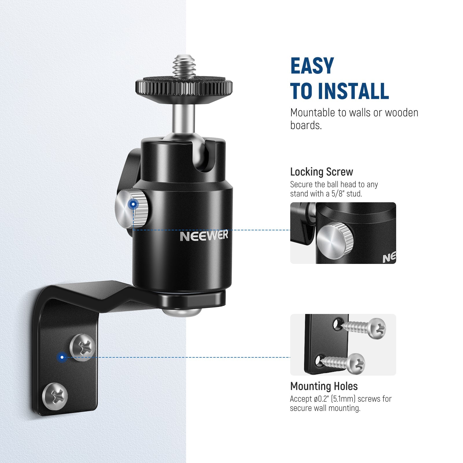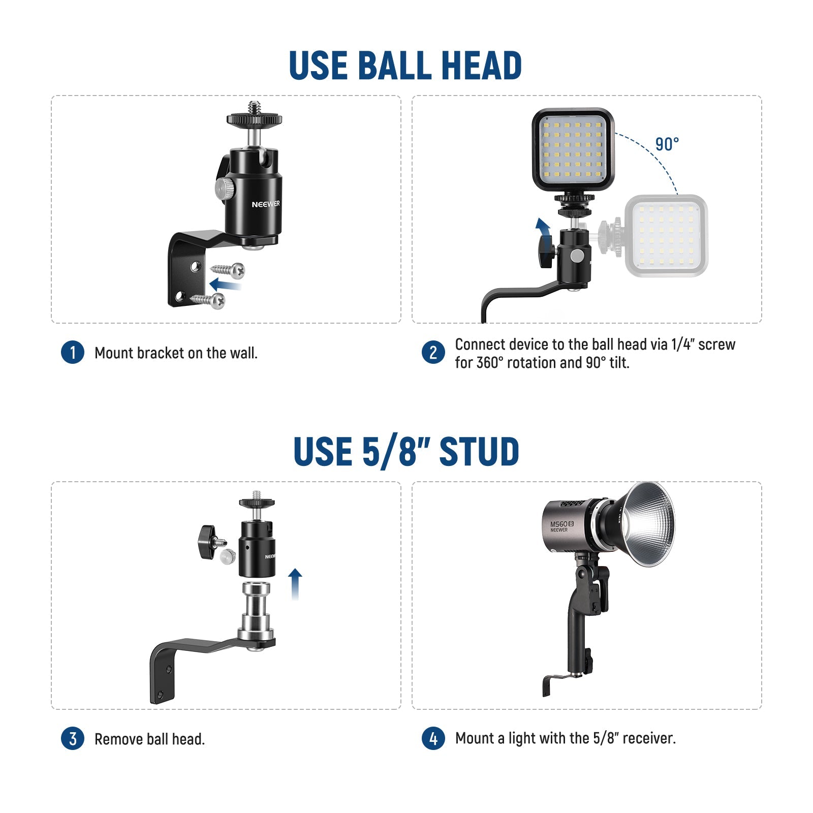 - 1/4" Screw & 5/8" Stud- The mount features a 5/8" stud and a 1/4" screw, making it compatible with various types of equipment, including ring lights, studio lighting LED video Lights, flash strobes, cameras, monitors