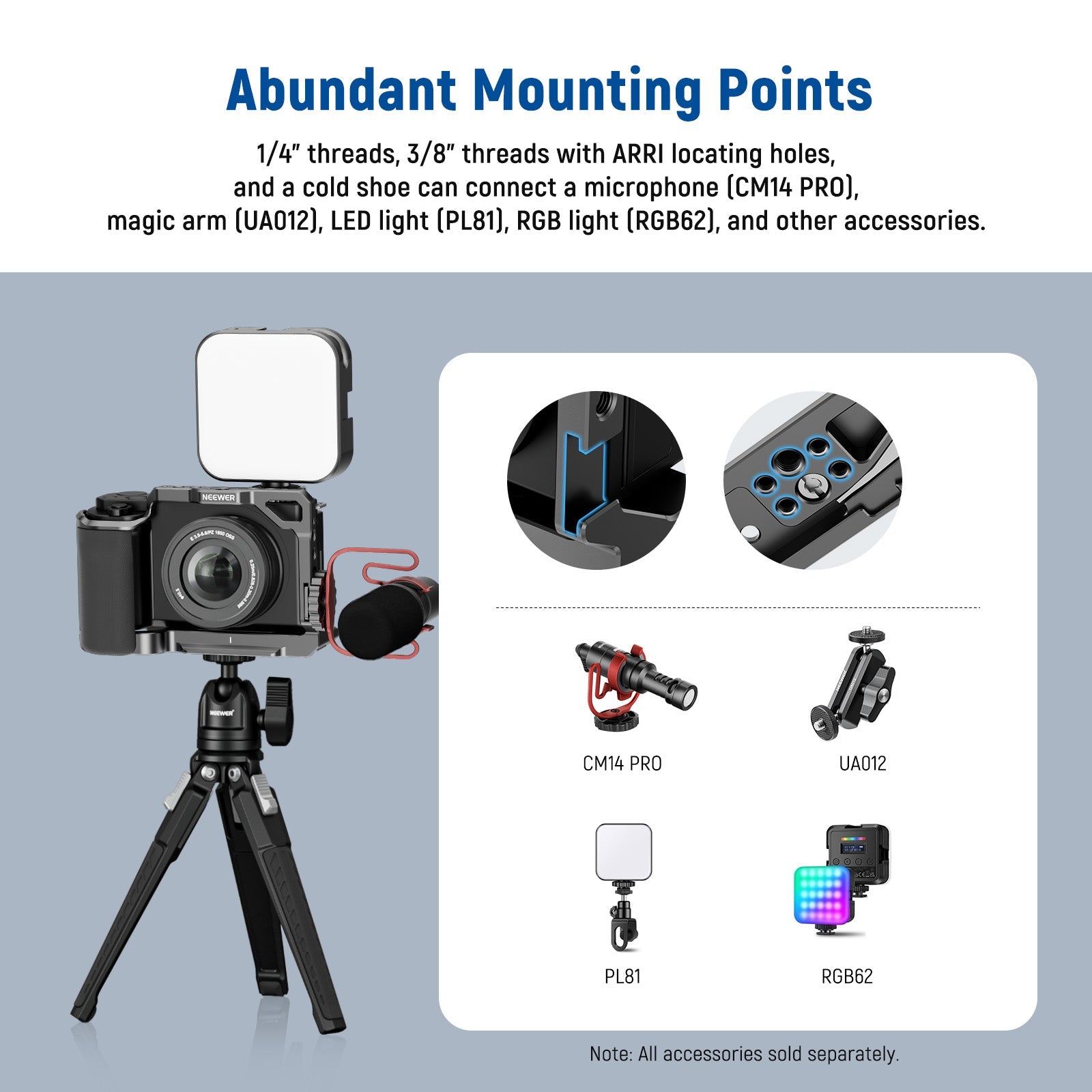 - Abundant Mounting Points- 1/4" threads, 3/8" threads with ARRI locating holes, and a cold shoe can connect a microphone (CM14 PRO), magic arm (UA012), LED light (PL81), RGB light (RGB62), and other accessories. The cage can be mounted on a tripod in vertical or horizontal directions. Compatible with SmallRig top handles side handles monitor mounts and other accessories