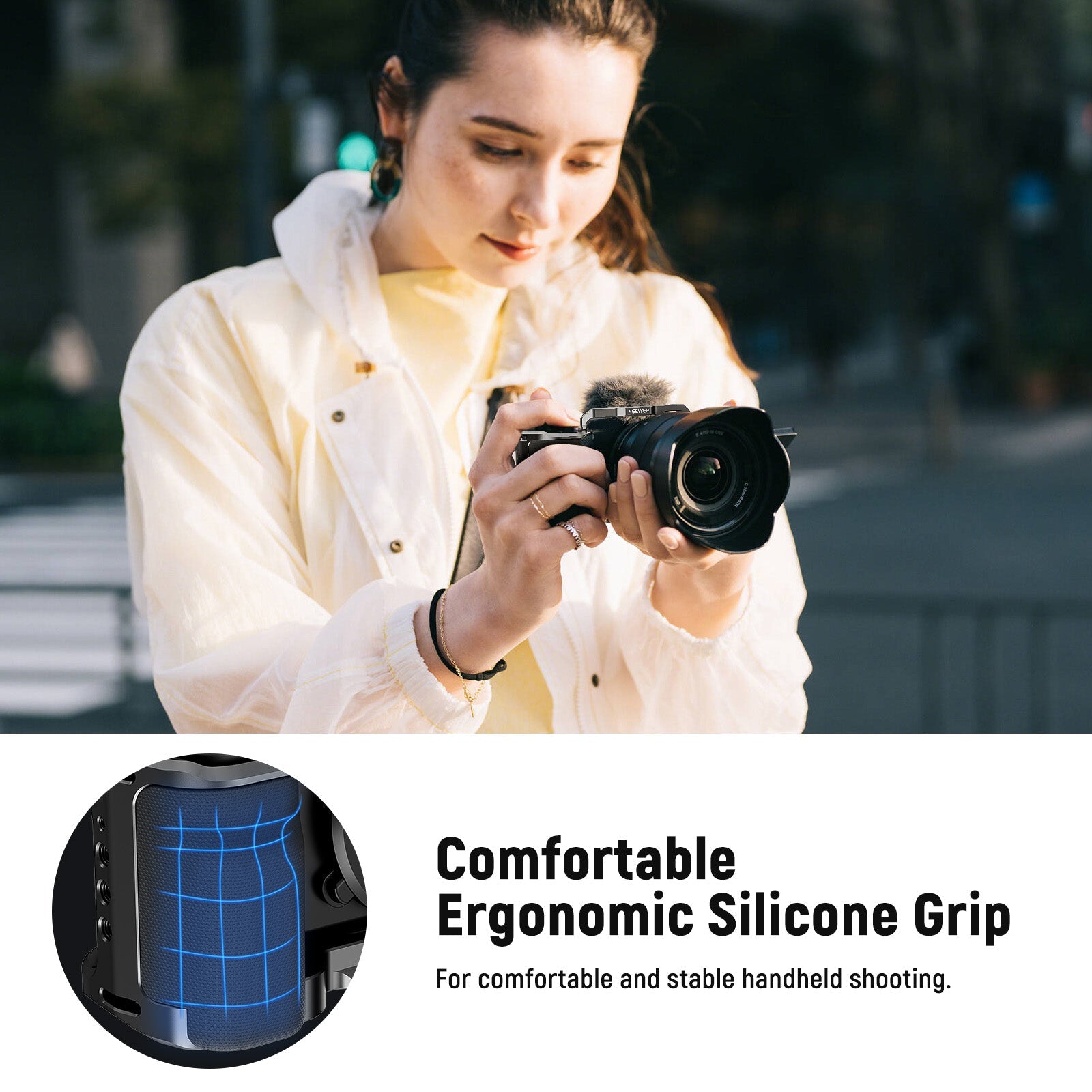 - Comfortable Ergonomic Silicone Grip- Designed for ergonomic handheld shooting, the nonslip silicone grip allows you to firmly hold the caged camera while ensuring a secure and comfortable grip
