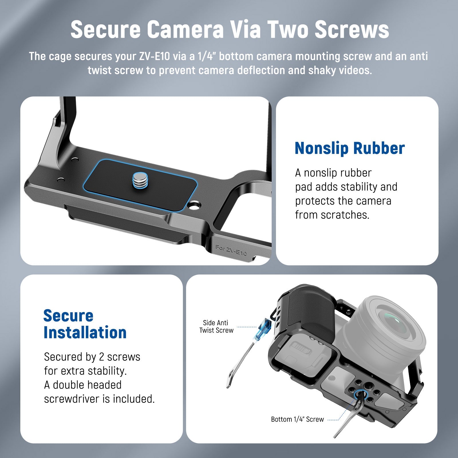 - Secure Camera Via Two Screws- The cage secures your ZV-E10 via a 1/4" bottom camera mounting screw and an anti twist screw to prevent camera deflection and shaky videos. A nonslip rubber pad adds stability and protects the camera from scratches