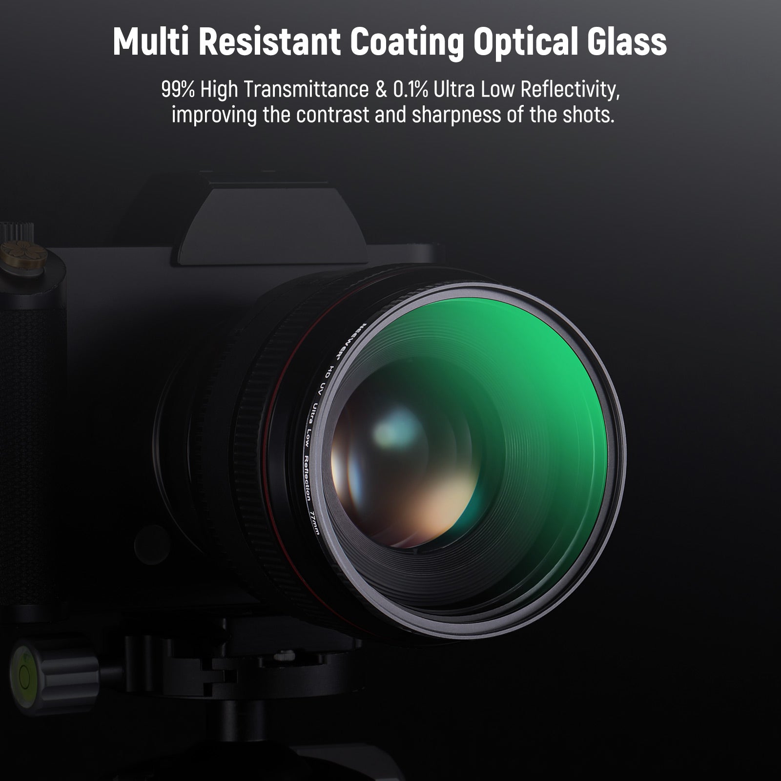 - 99% High Transmittance & 0.1% Ultra Low Reflectivity- This camera lens UV filter with premium ultra clear optical glass provides up to 99% light transmittance and low to 0.1% reflectivity, improving the contrast and sharpness of the shots