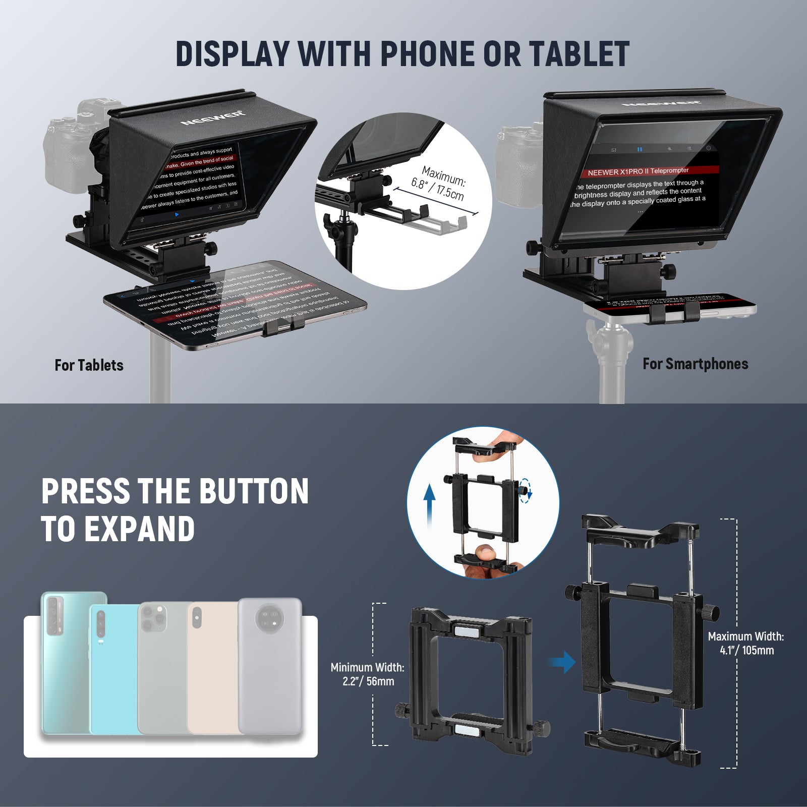 - Teleprompter for Phone/Camera- NEEWER X1 Pro II Teleprompter is perfect for recording natural and engaging videos using smartphones or cameras. It comes with a plate with magnetic phone clamp and an extra metal phone mount that support phones in horizontal and vertical directions, compatible with iPhone 16 Pro 16 Pro Max 15 14 13 12 Samsung Galaxy S23 S22 Ultra. A lens hood is applicable to various cameras and support wide angle lenses with a focal length ≥28mm
